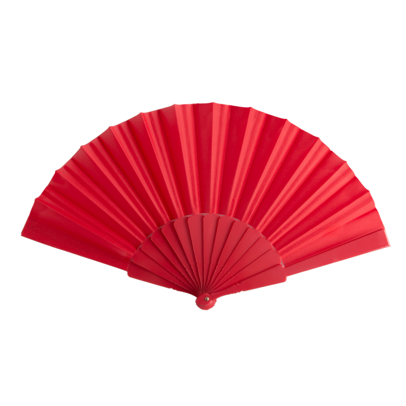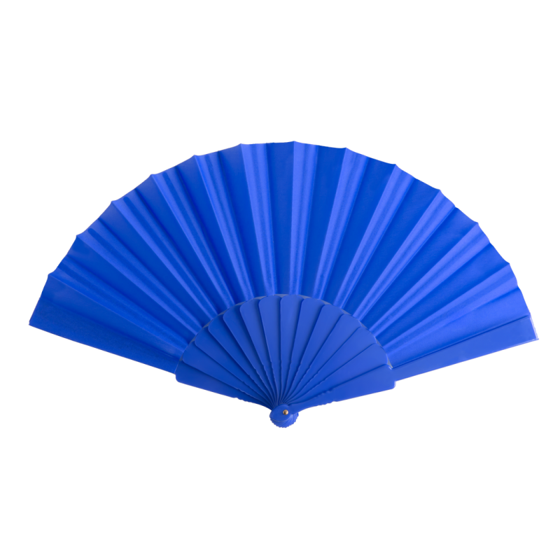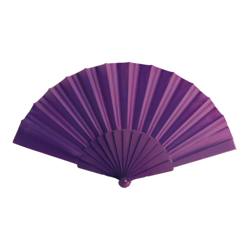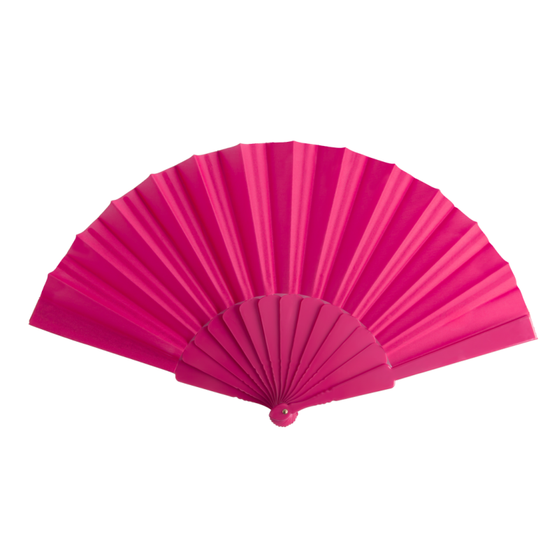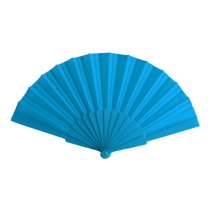 Abanico con varillas fabricadas en resistente plástico y tela en poliéster. Varillas y tela a juego, disponible en variada gama de colores. Presentado en caja individual blanca con ventana.