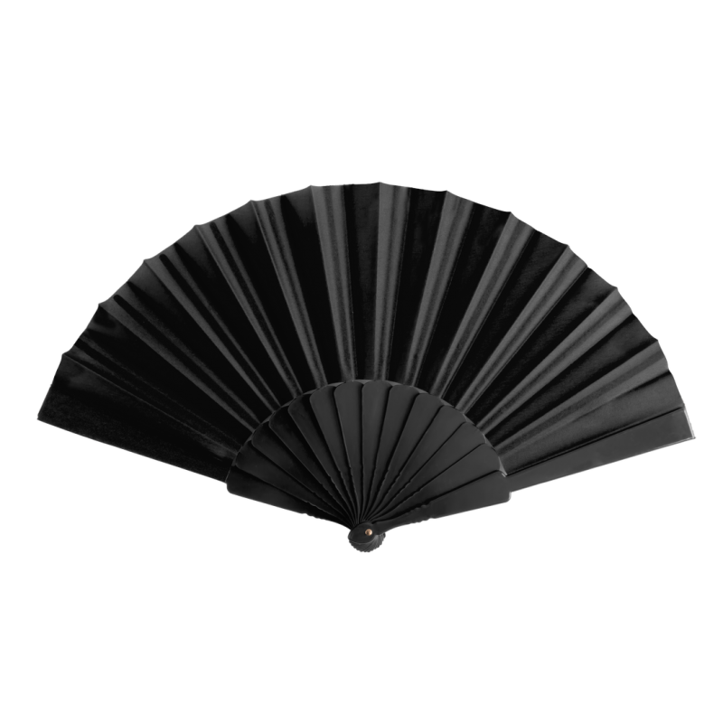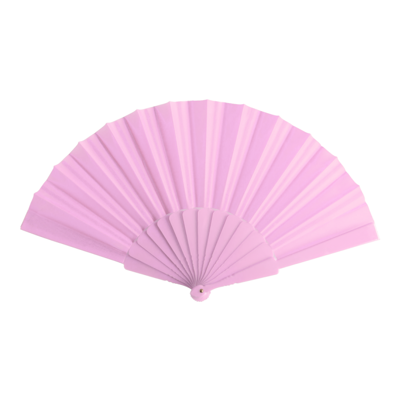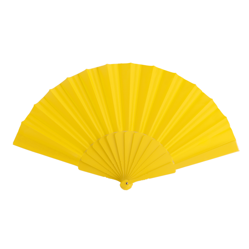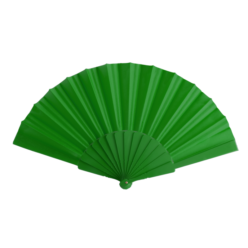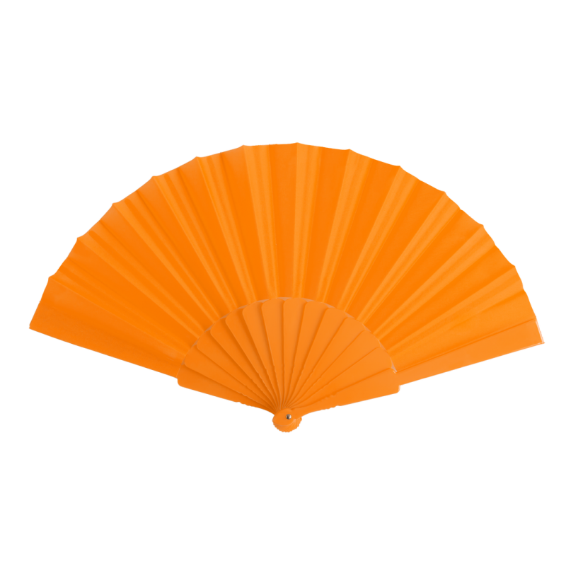 Abanico con varillas fabricadas en resistente plástico y tela en poliéster. Varillas y tela a juego, disponible en variada gama de colores. Presentado en caja individual blanca con ventana.