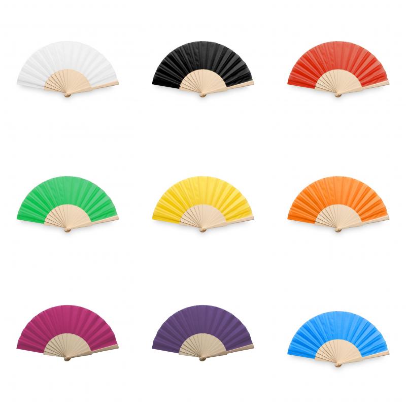 Abanico de línea nature con varillas fabricadas en resistente madera de acabado natural. Tela en resistente poliéster 190T, disponible en variada gama de colores y presentado en una caja de cartón individual blanca.