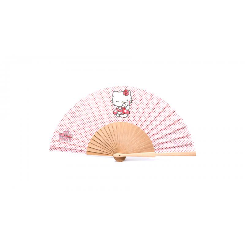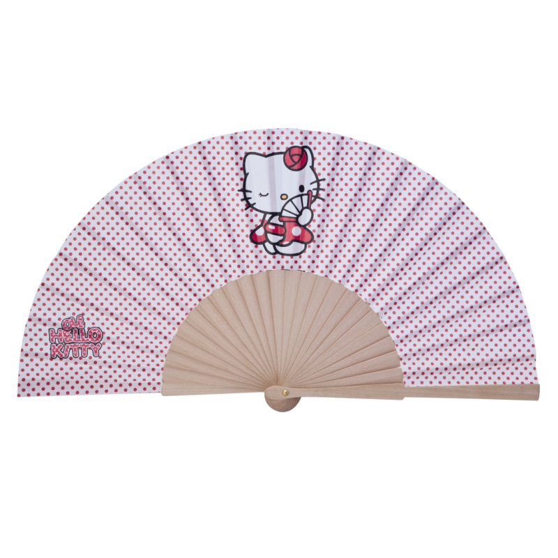 Abanico de Hello Kitty con varillas en madera natural y original diseño en tela con gatito de la marca. Presentado en caja individual.