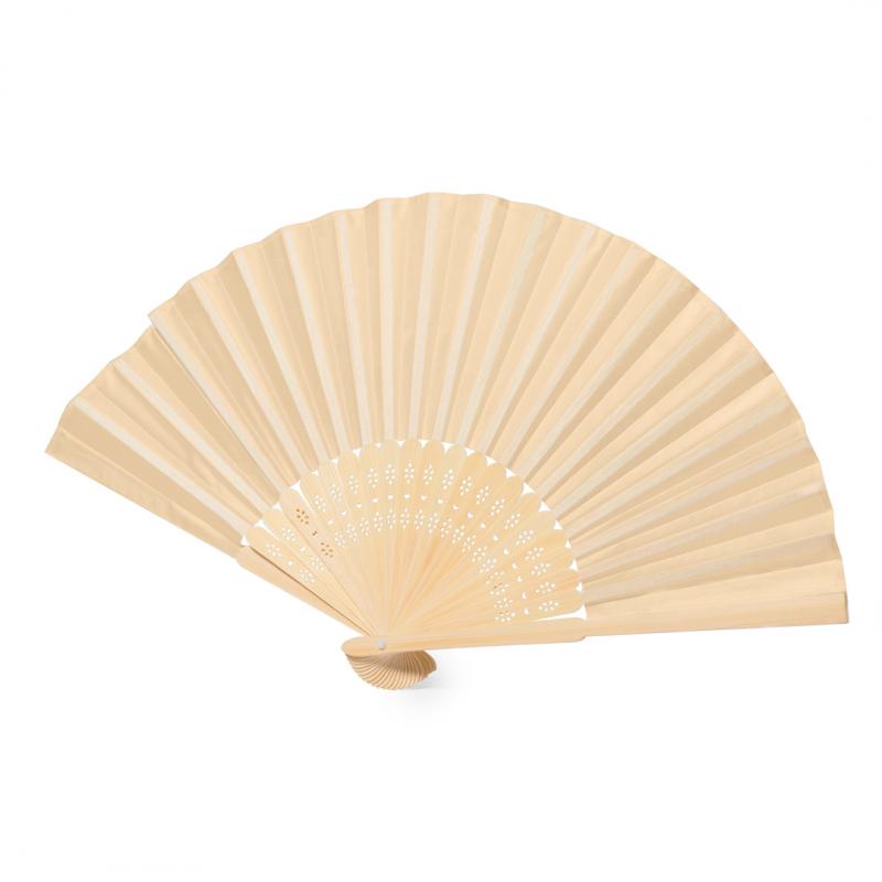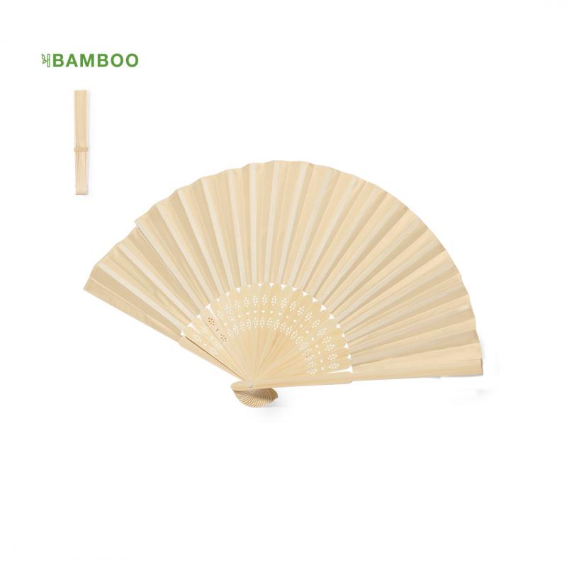 Abanico fabricado con varillas de bambú y tela de poliéster. En tonos naturales y presentado en caja individual diseño kraft.Materiales como el bambú fomentan la utilización de materias primas naturales, reduciendo las emisiones contaminantes. Proviene de una planta de gran resistencia y versatilidad, con crecimiento y regeneración rápidos, siendo una excelente alternativa al uso de madera tradicional.