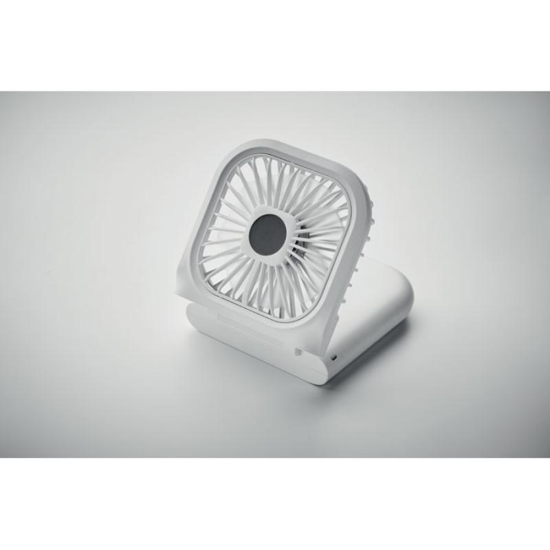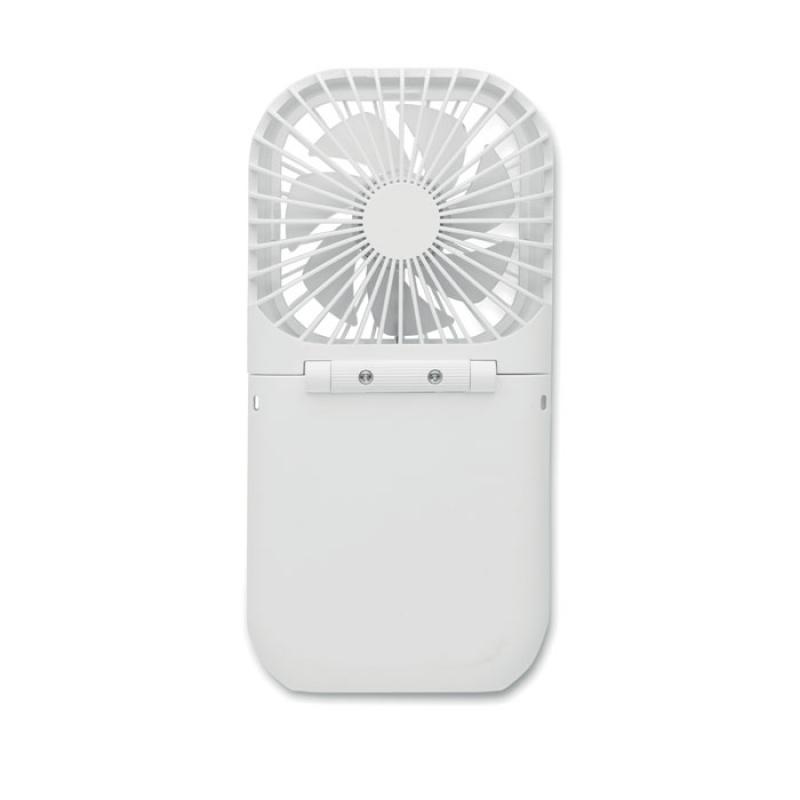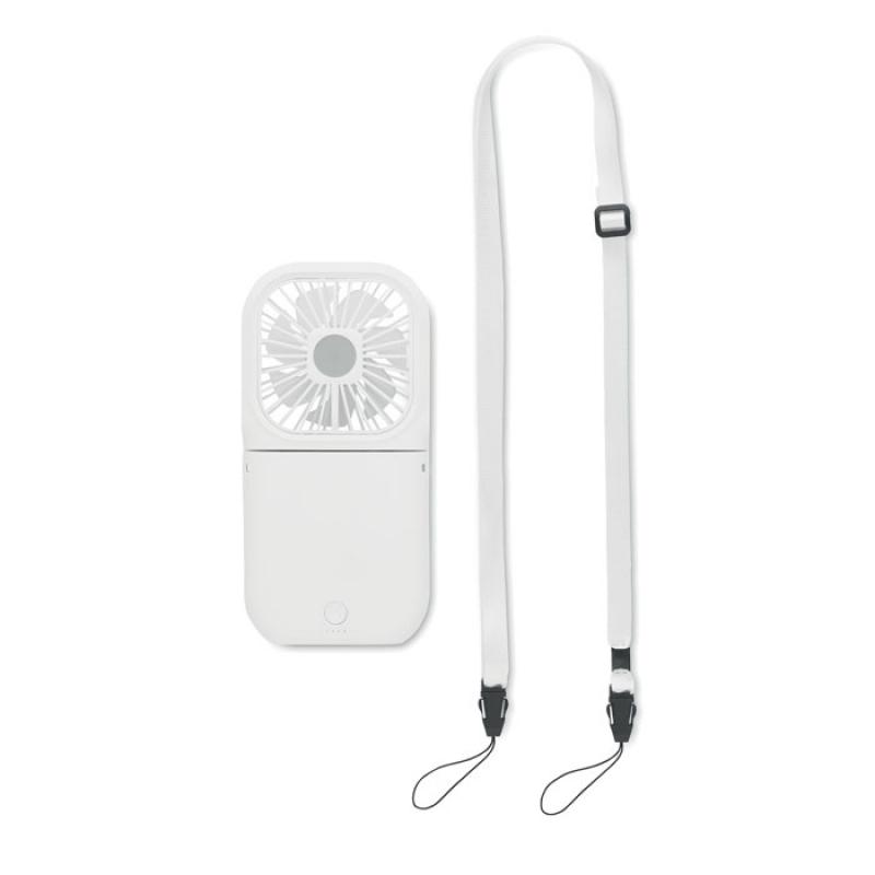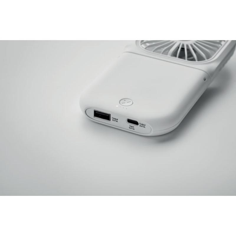 Ventilador portátil plegable con correa ajustable para el cuello. 3 velocidades. También se puede utilizar como ventilador de escritorio cuando está plegado. Power bank con batería recargable de 3000 mAh. In/Output: Tipo-C & output tipo A.Recipiente :