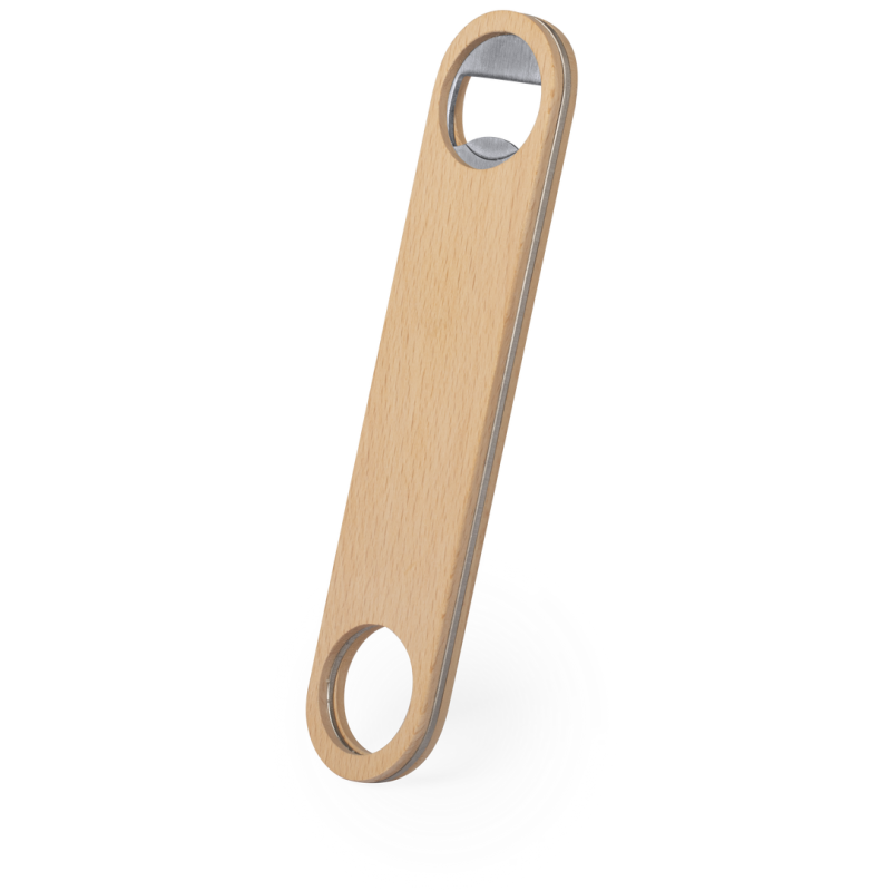 Abridor de madera de haya pulida con interior en acero inox, con troquelado para colgar.