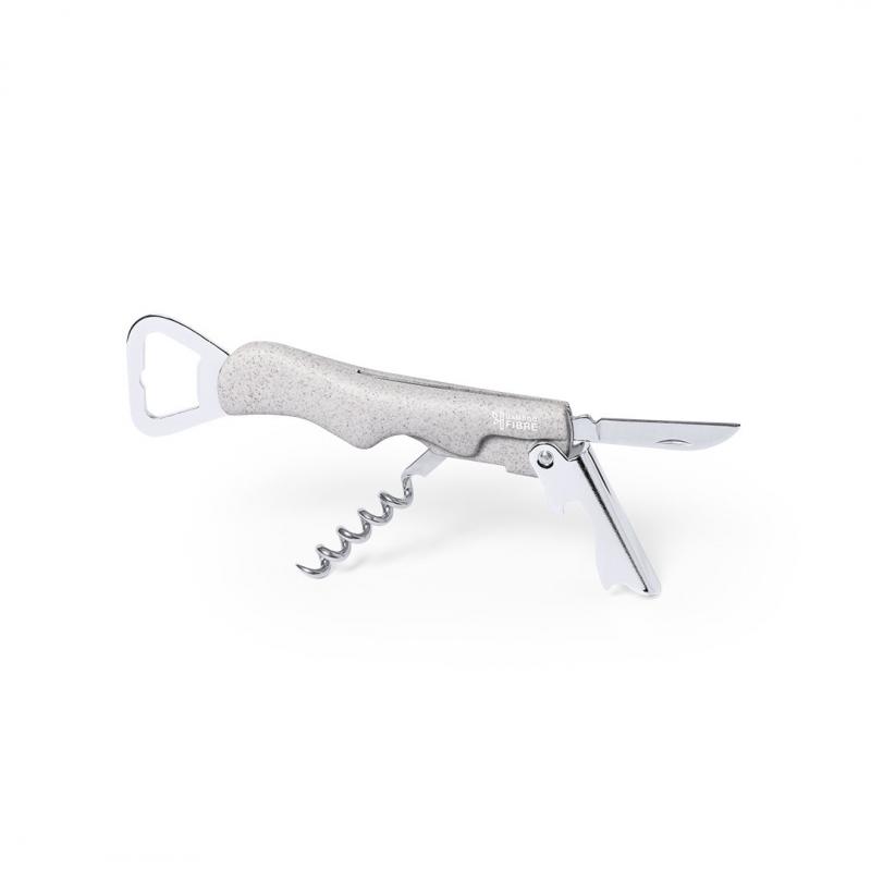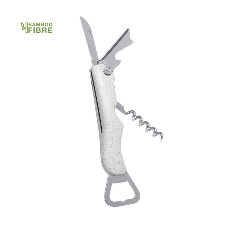 Sacacorchos de línea nature con abridor de botellas y cortacápsulas. Fabricado en fibra de bambú y ABS, con accesorios en acero inox. Presentado en atractiva caja individual de diseño eco.