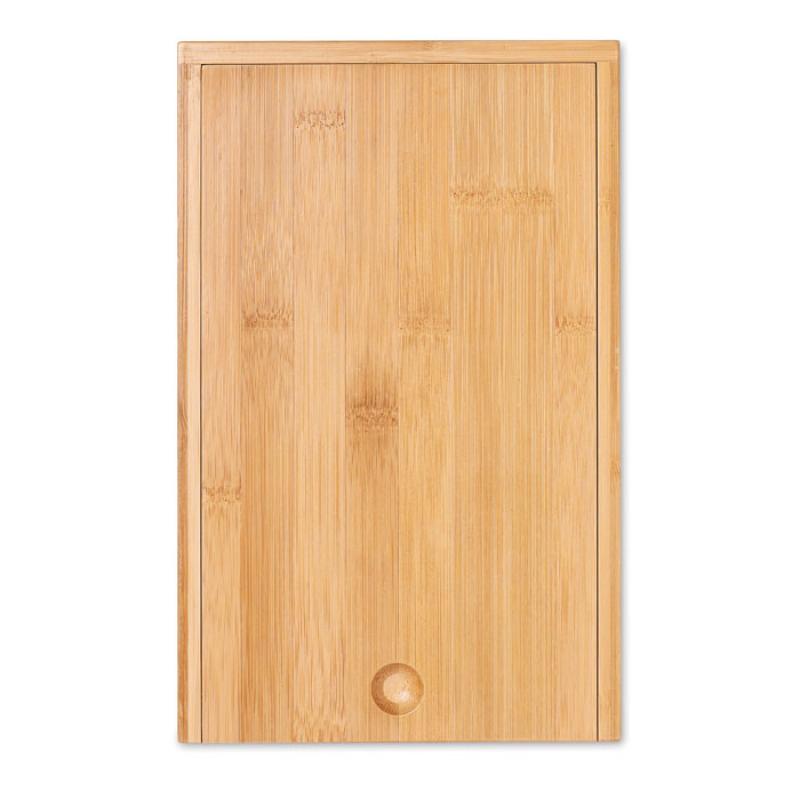 Set de queso con accesorios para vino. Presentado en estuche fabricado en bambú. Incluye cuchillo de acero inoxidable, rayador de queso, sacacorchos y tapón de acero inoxidable.