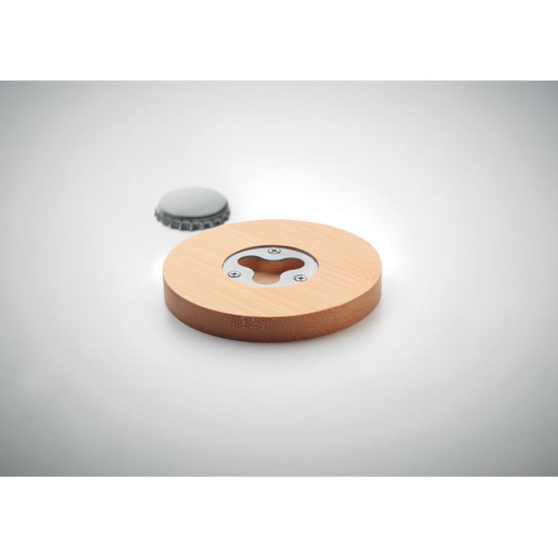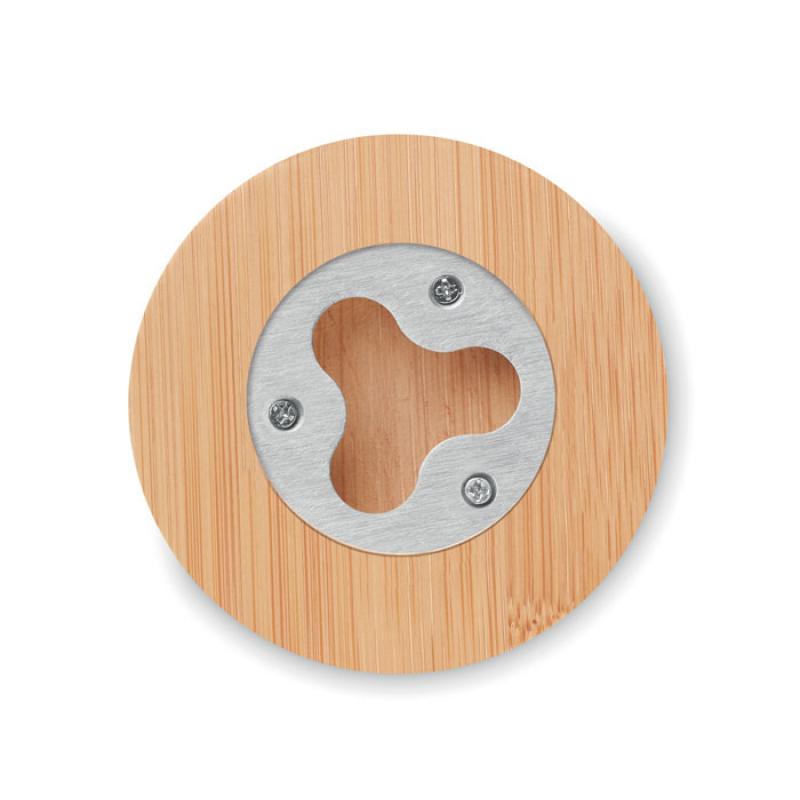 Abrebotellas de bambú con función de posavasos. El bambú es un producto natural, puede haber ligeras variaciones en el color y el tamaño por artículo, lo que puede afectar el resultado final de la impresión.