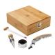 Set de vino suministrado en caja, fabricado en bambú y zinc. En su interior incluye un sacacorchos con navaja sommelier, un termómetro, un tapón y gargantilla recoge gotasRecipiente :
