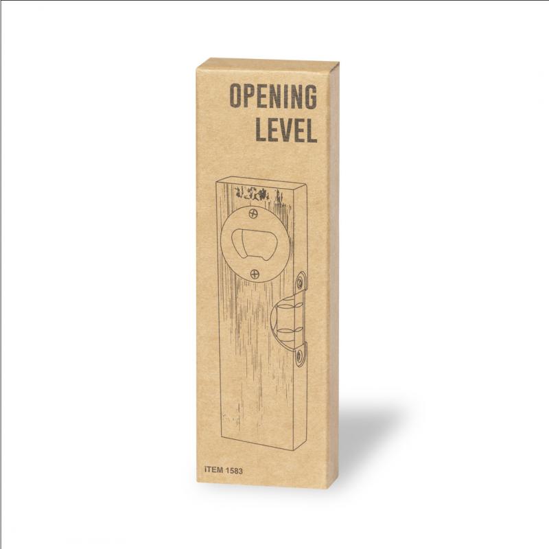 Nivel de línea nature fabricado en bambú, con abridor metálico integrado. Presentación en caja individual de diseño kraft.