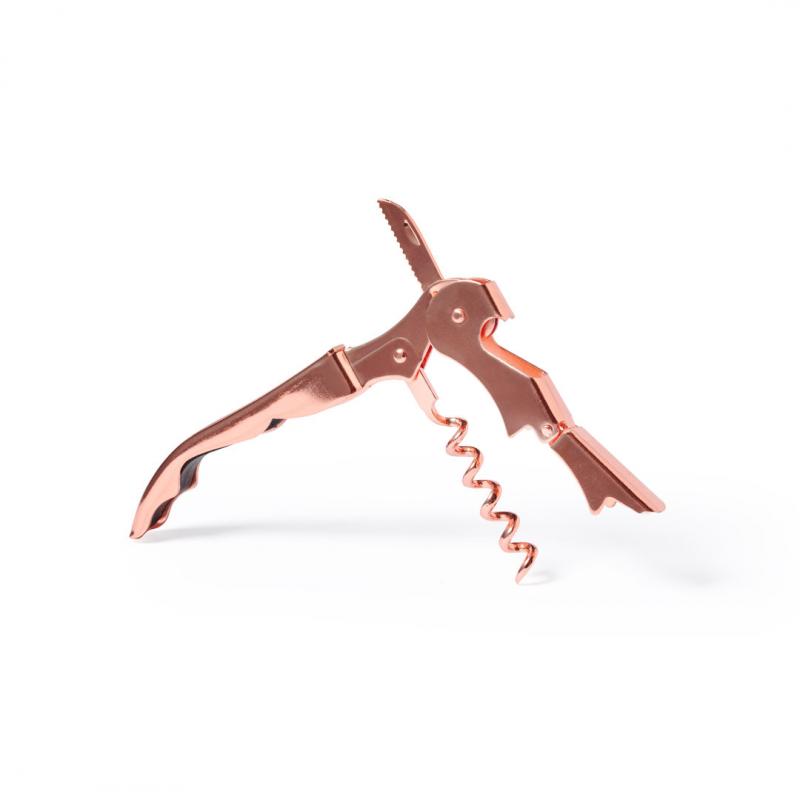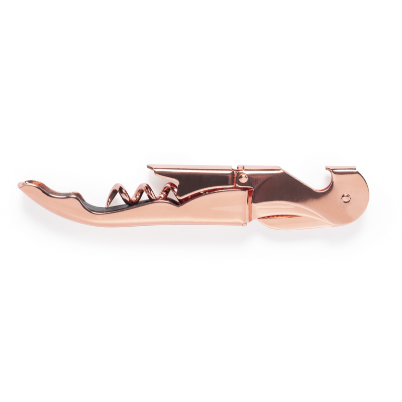 Sacacorchos de 2 tiempos fabricado en acero inox, con recubrimiento exterior en cobre galvanizado. Cortacápsulas integrado y presentado en caja individual de diseño.