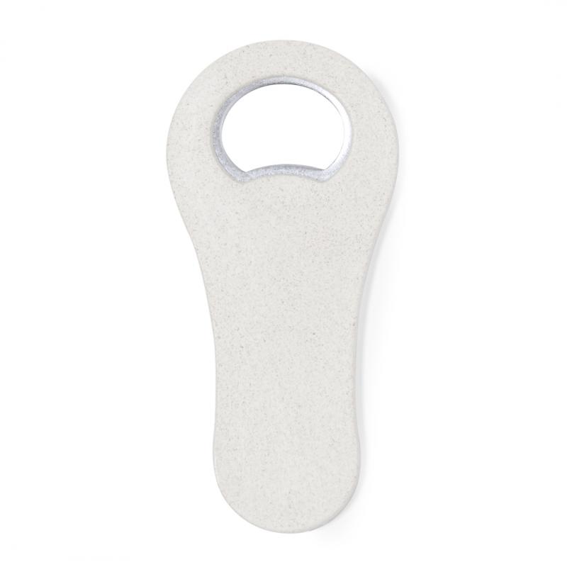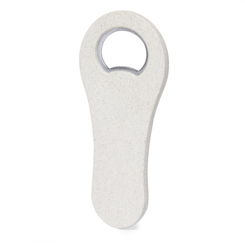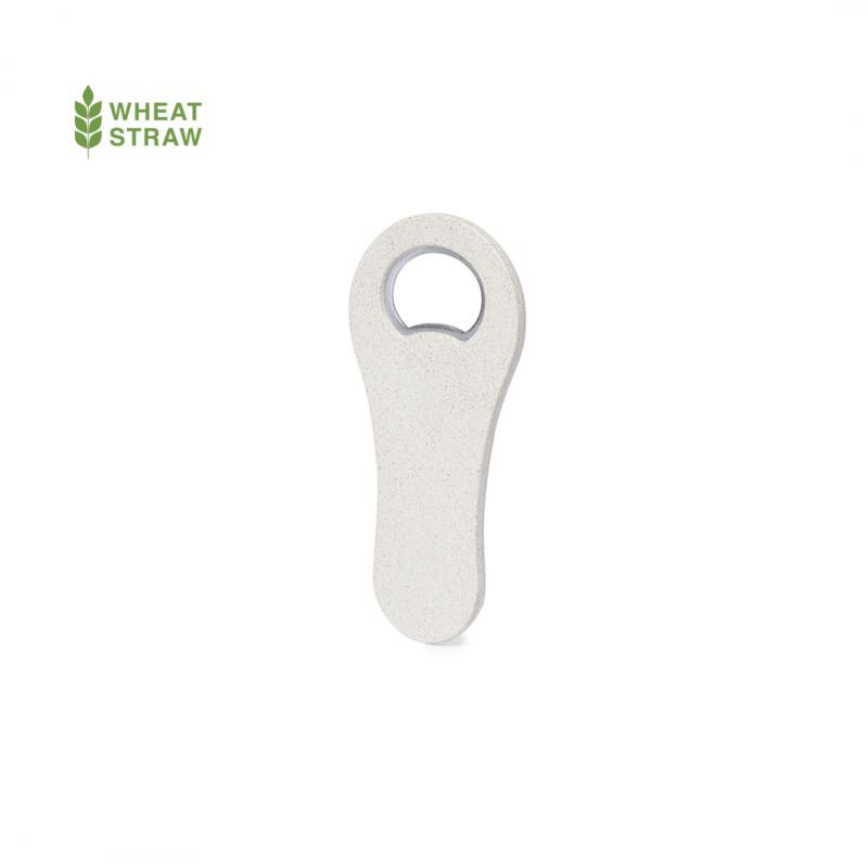 Abridor de botellas fabricado en caña de trigo. Cuenta con un imán que permite adherirlo a cualquier superficie metálica. Presentado individualmente en bolsa de papel reciclada. La caña de trigo fomenta la utilización de materias primas naturales, reduciendo así las emisiones contaminantes.