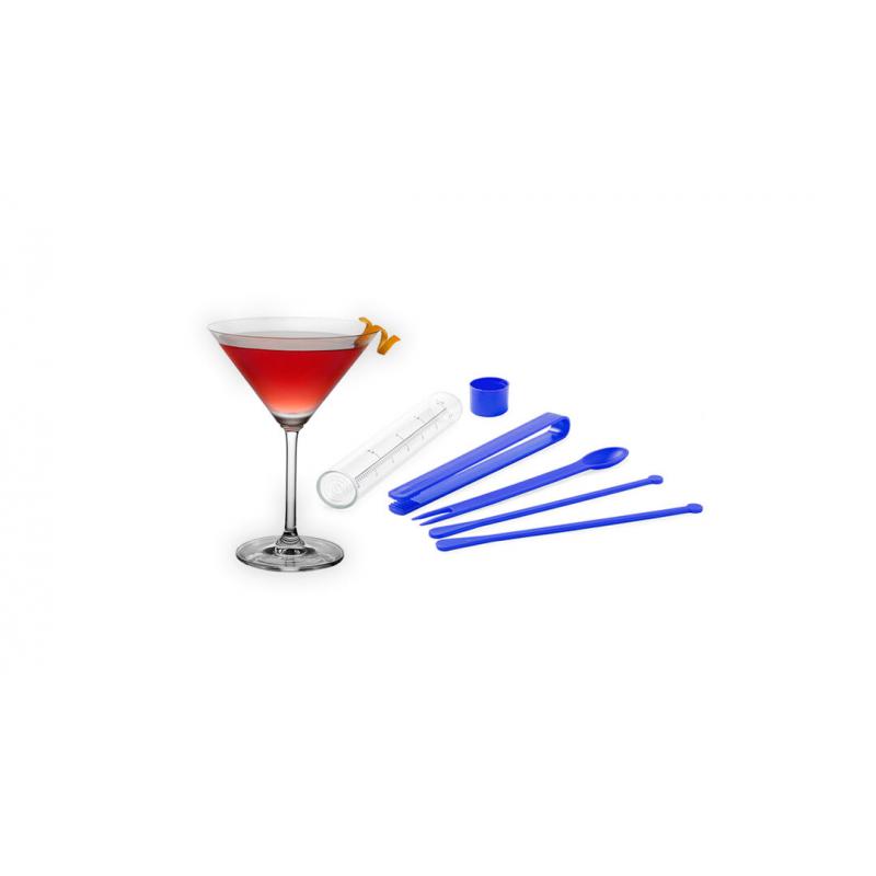 Set para cocktails de 5 accesorios en variada gama de vivos colores. Incluye envase medidor de 60ml de capacidad, cuchara trinchador, pinzas y dos agitadores.