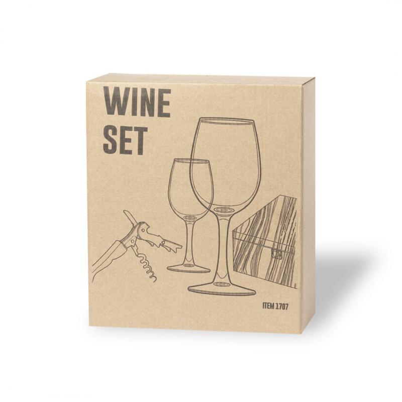 Set de vinos en elegante estuche de bambú con interior troquelado en espuma. Incluye 2 copas de cristal de 350 ml y sacacorchos de 2 tiempos en acero inox, con cortacápsulas. Presentación en caja individual de diseño kraft.