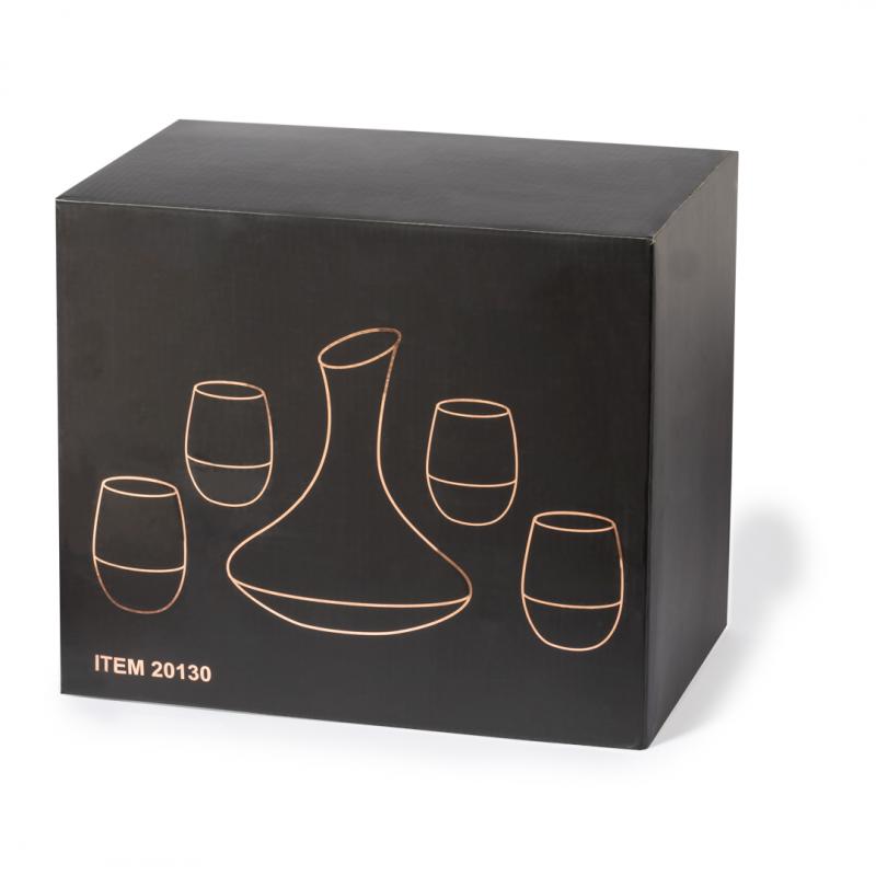 Elegante set de vinos fabricado en cristal, con delicado e innovador recubrimiento rosado degradado. Un regalo de diseño que incluye 4 vasos de 500 ml y un decantador de 1,8 l.Presentado en exclusiva caja individual de diseño negra.