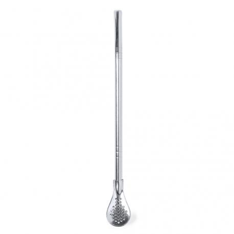 Práctico agitador con pajita en acero inox. Con diseño elegante y funcional, este accesorio es esencial para bebidas frías o calientes. Pajita integrada que permite absorber con facilidad y en el extremo inferior una práctica cucharilla con filtro. Presentado en una bolsa individual.