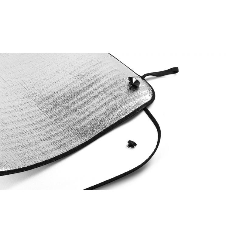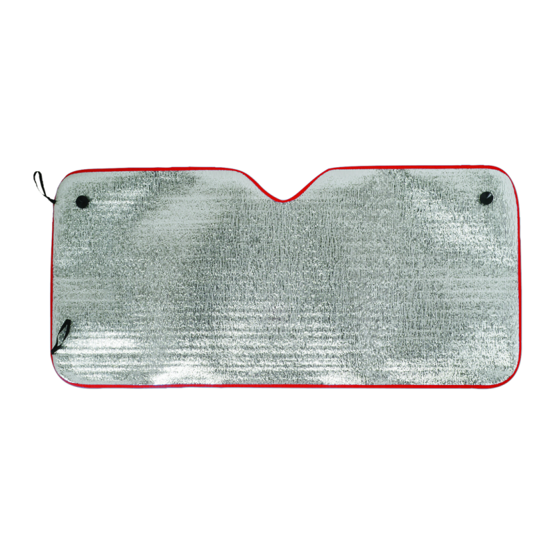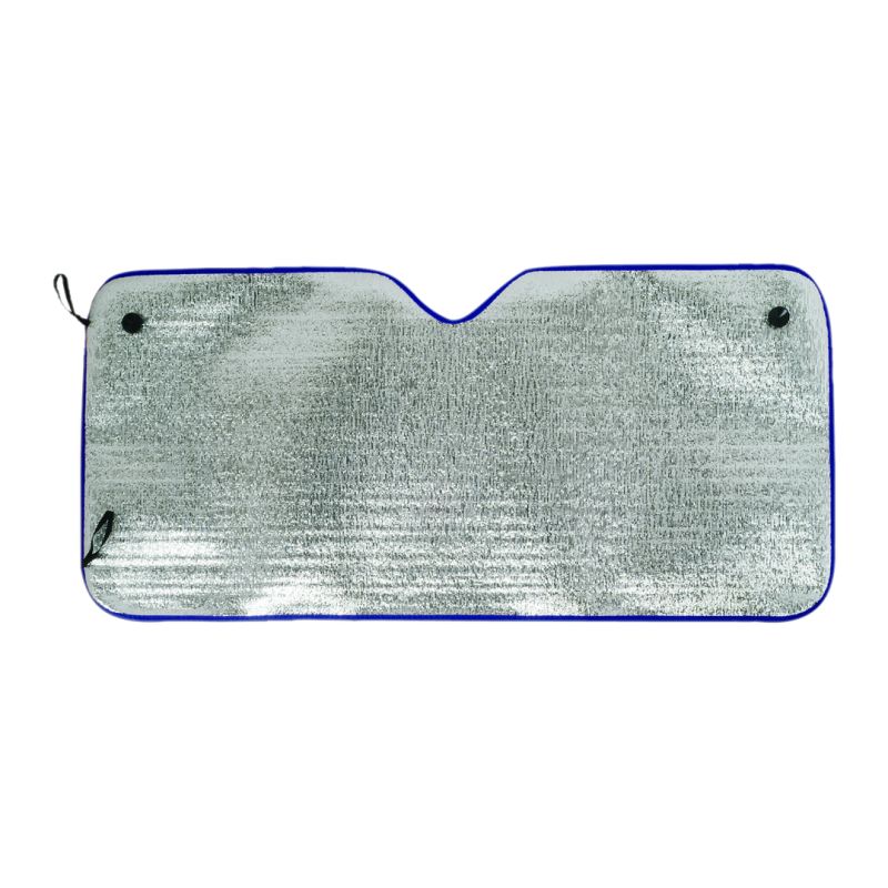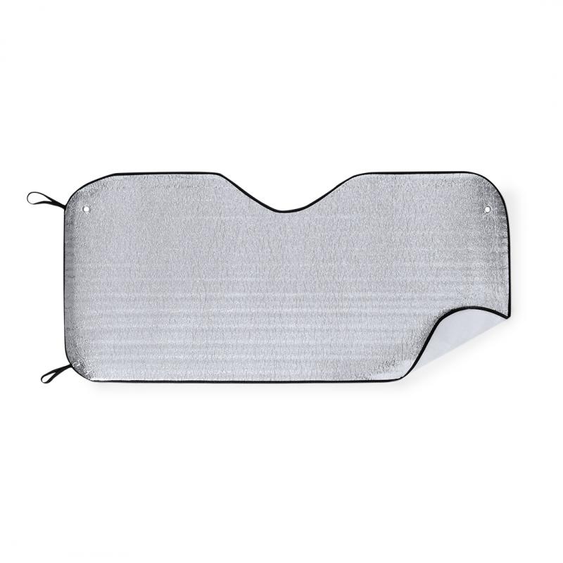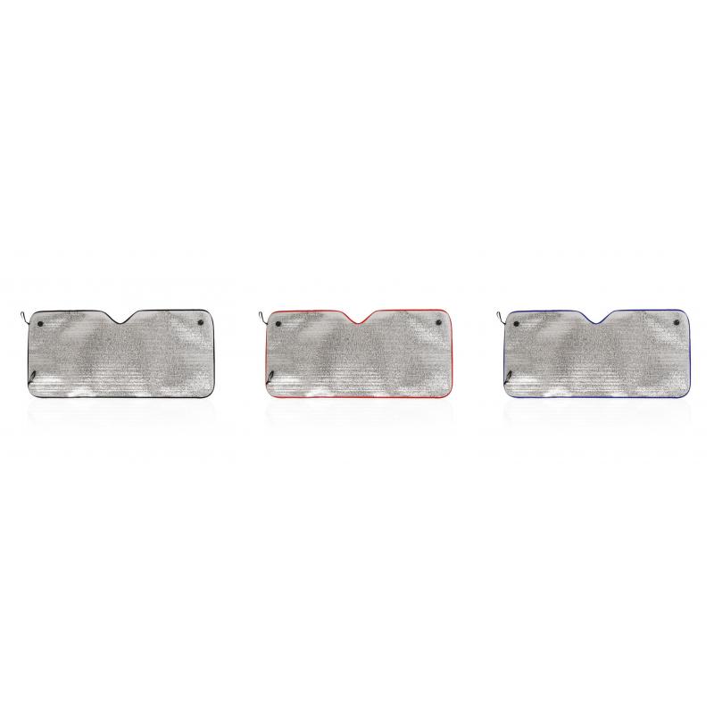 Parasol en aluminio a una cara en color plateado de acabado metalizado con ribetes de poliéster en vivos colores. De tamaño 130x60cm y espuma en el reverso. Cintas elásticas de ajuste con argollas metálicas de refuerzo, dos ventosas para ajuste en luna y presentación desplegado en plancha para fácil impresión.