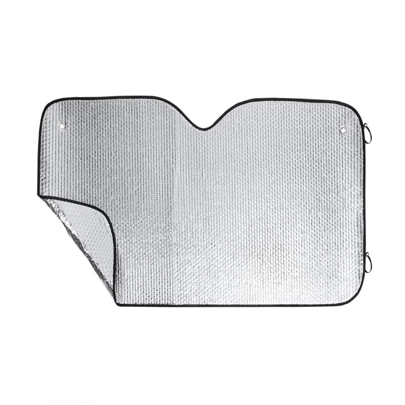Parasol en aluminio con burbuja en ambas caras en color plateado de acabado metalizado con ribetes en color negro. De tamaño 130x80cm, con argollas metálicas de refuerzo, cintas elásticas para plegado, dos ventosas para ajuste en luna y presentación desplegado en plancha para fácil impresión.