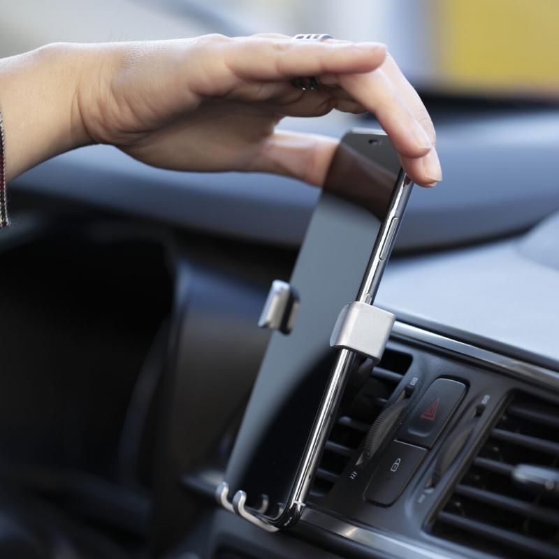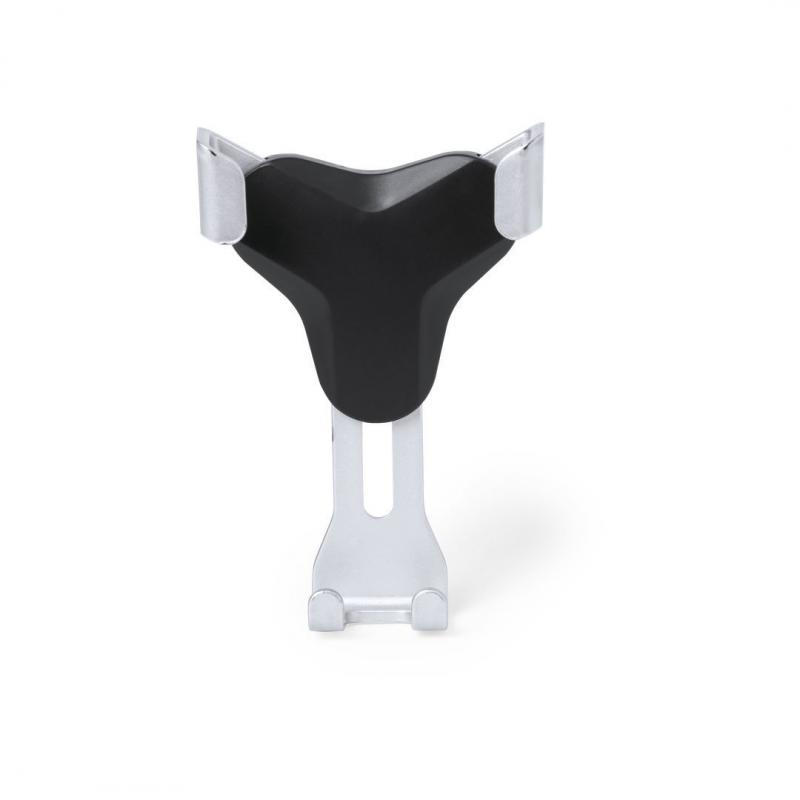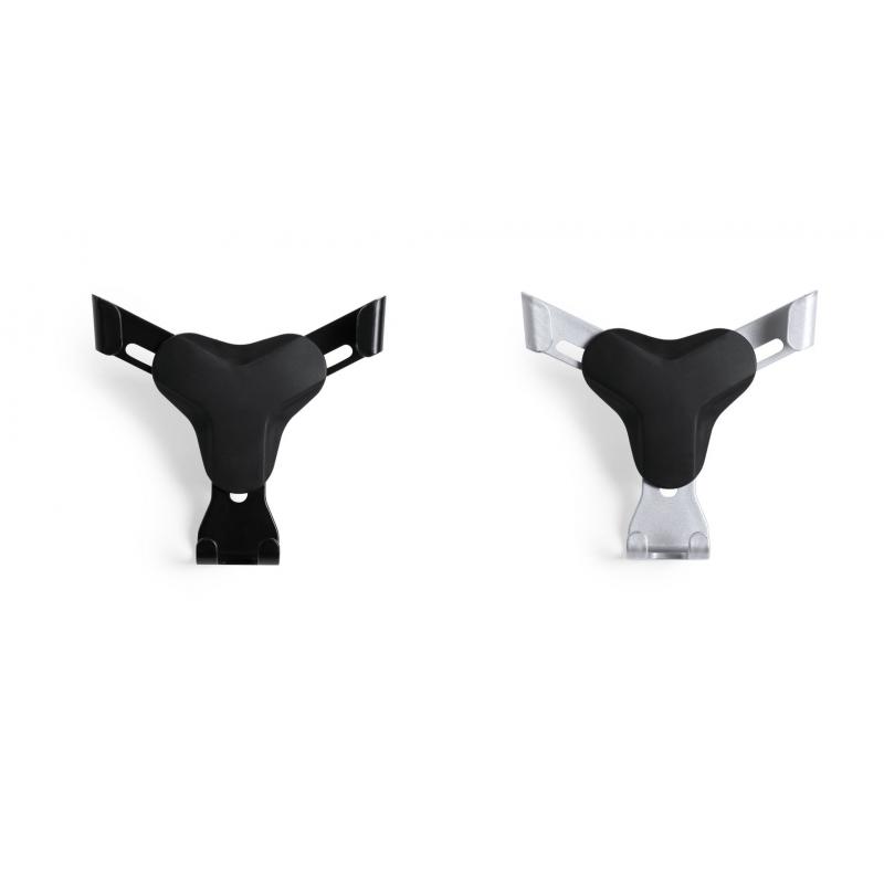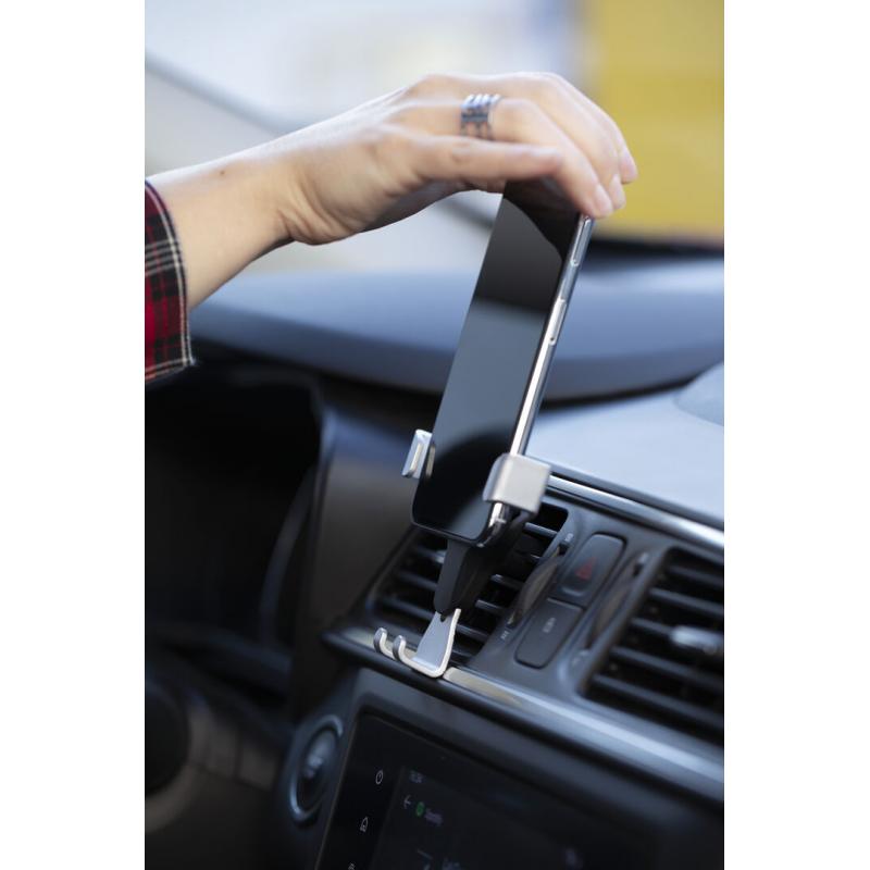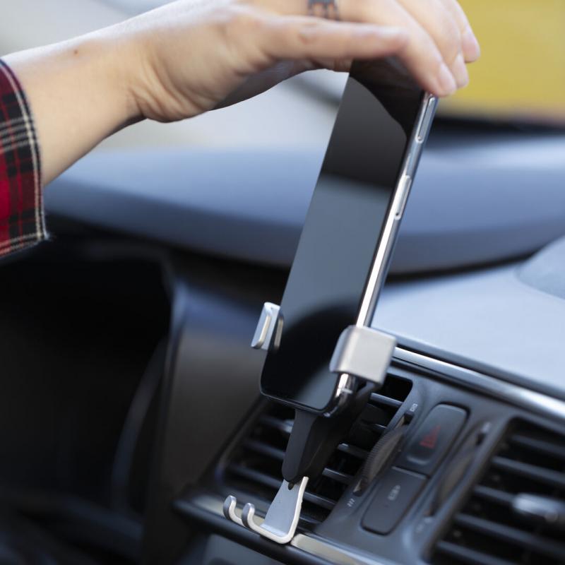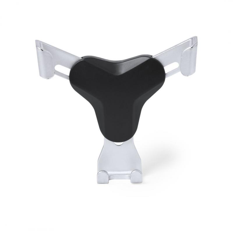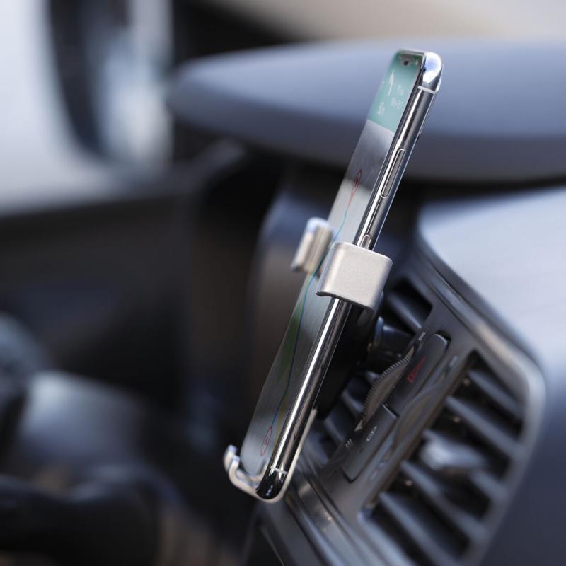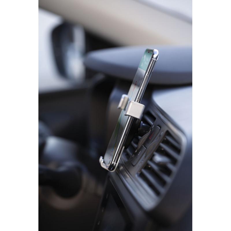 Ingenioso soporte para smartphone de diseño minimalista y especialmente diseñado para smartphones tamaño XXL. Con sistema de fijación universal que se activa por el propio peso del teléfono, ajustando las pinzas de agarre una vez que se sitúa el dispositivo en el soporte. Para rejilla de ventilación del automóvil y con frontal especialmente diseñado para marcaje en tampografía.