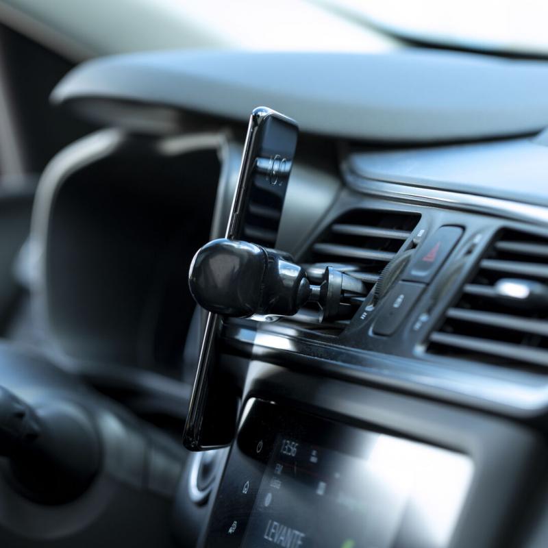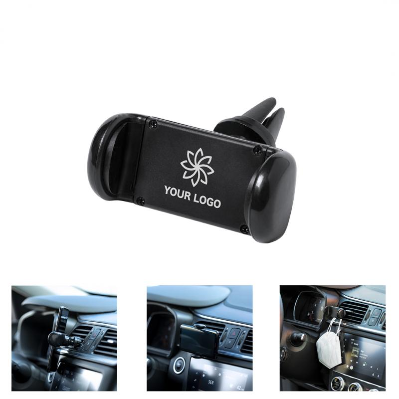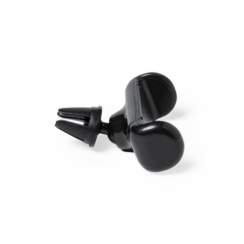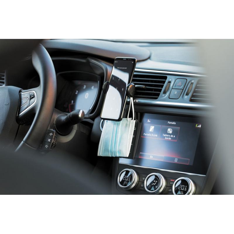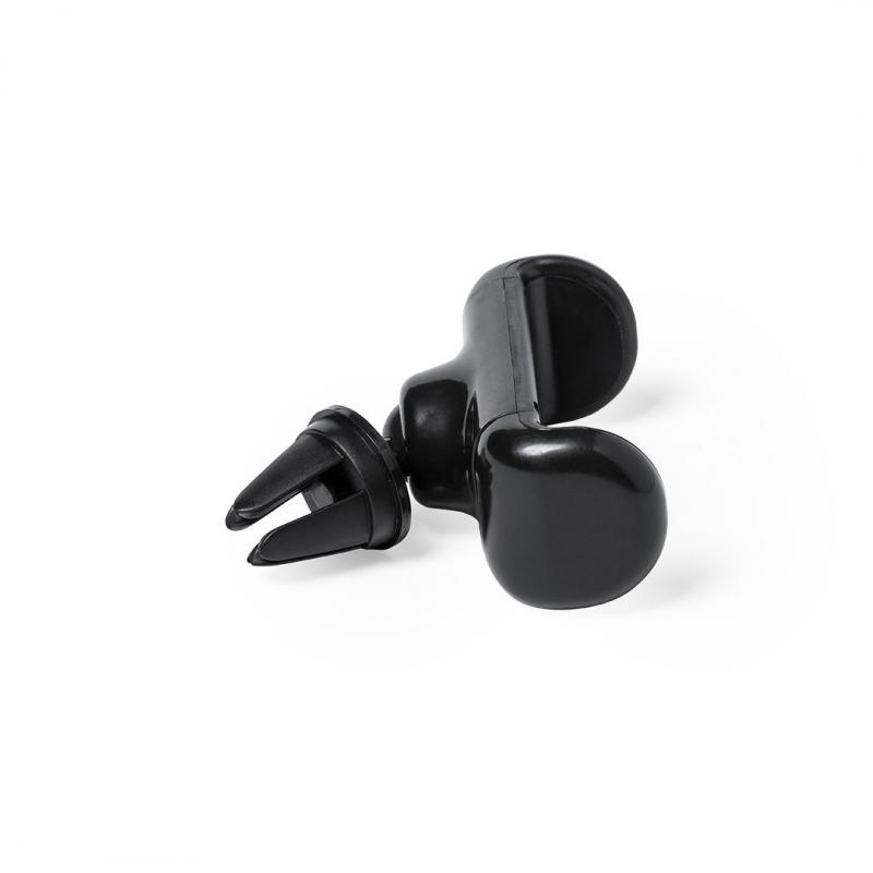 Soporte ajustable para smartphone de diseño minimalista, con base rotatoria 360º y de elegante acabado en color negro. Con sistema de fijación para rejilla de ventilación del automóvil y amplia superficie de marcaje, diseñado especialmente para tampografía.