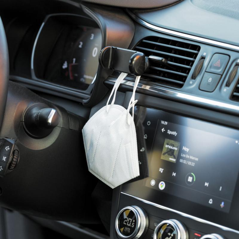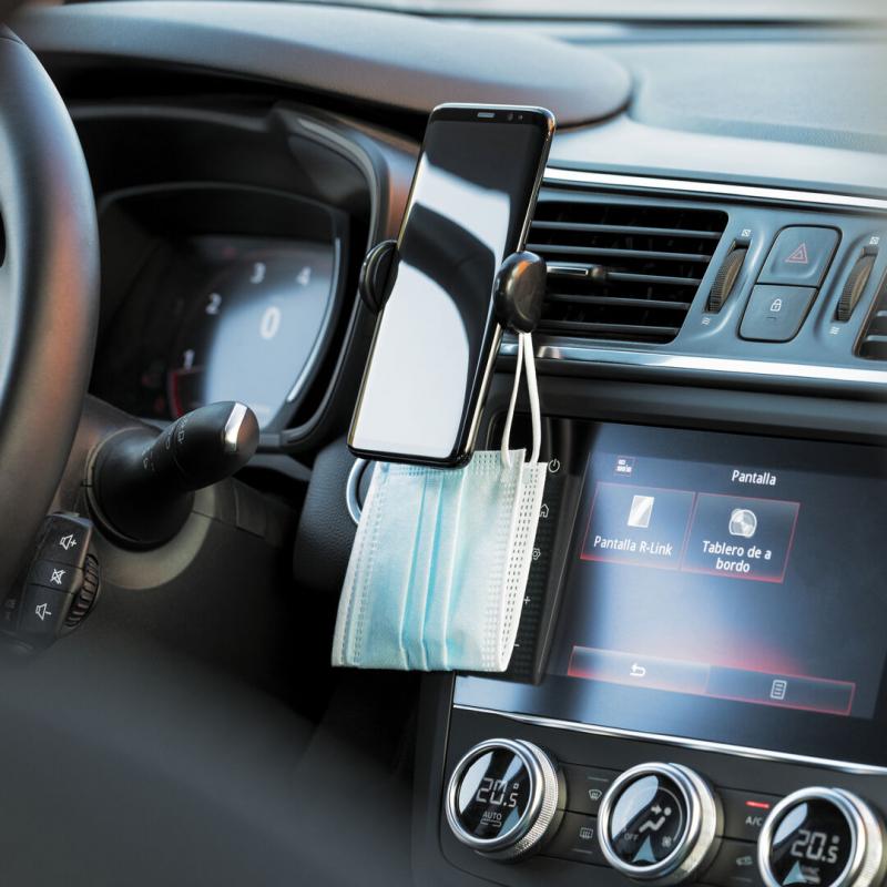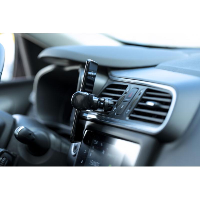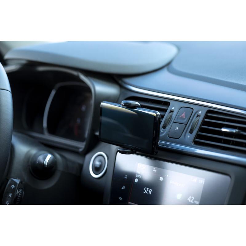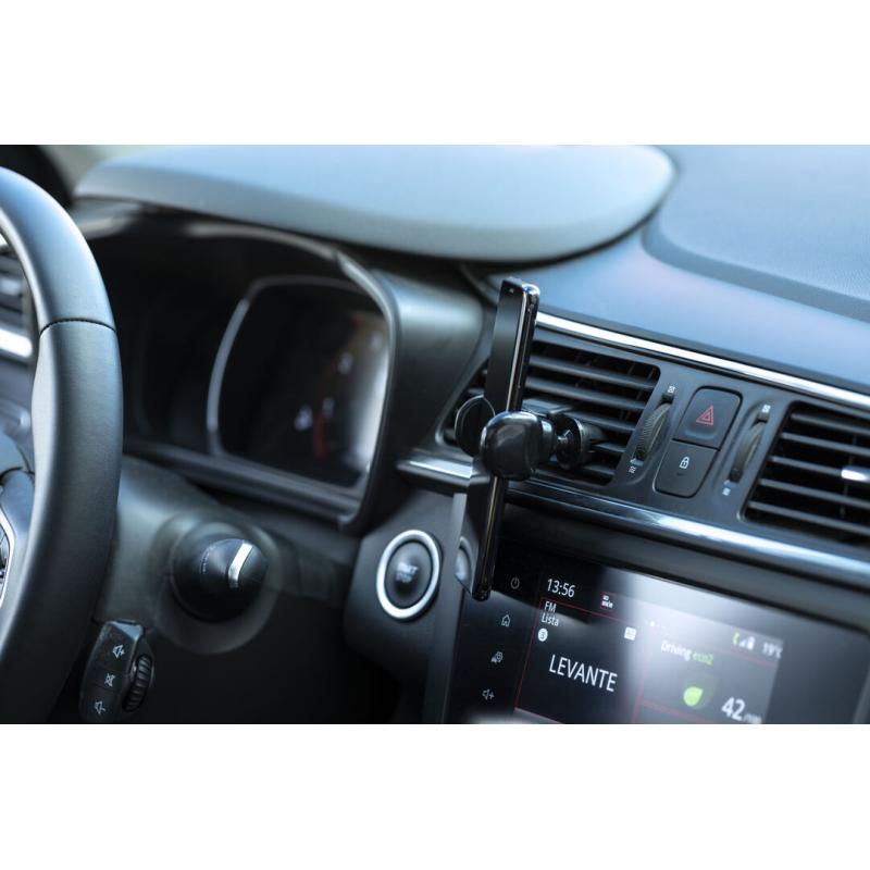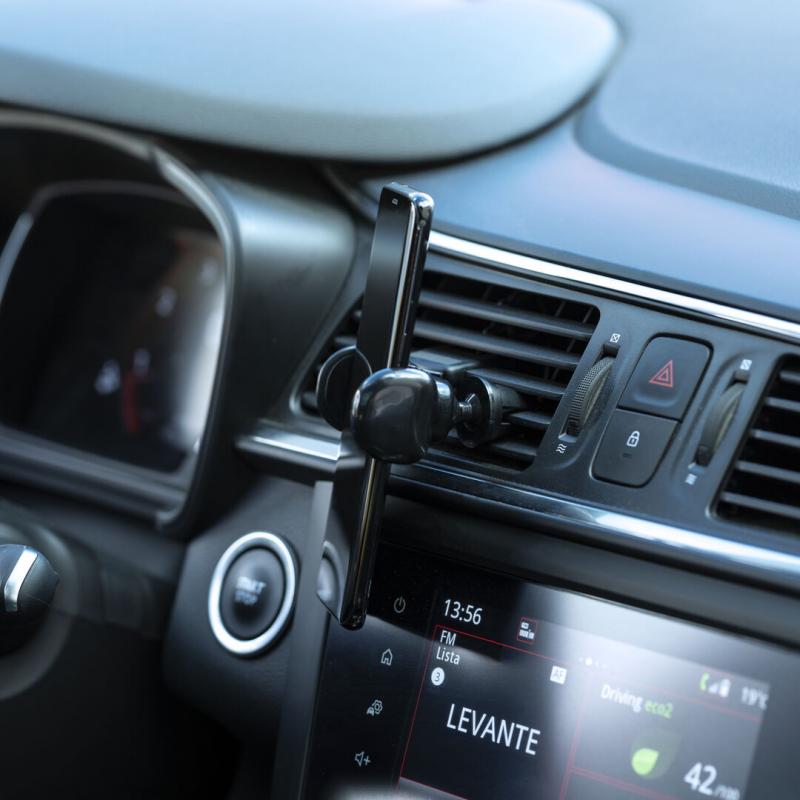Soporte ajustable para smartphone de diseño minimalista, con base rotatoria 360º y de elegante acabado en color negro. Con sistema de fijación para rejilla de ventilación del automóvil y amplia superficie de marcaje, diseñado especialmente para tampografía.