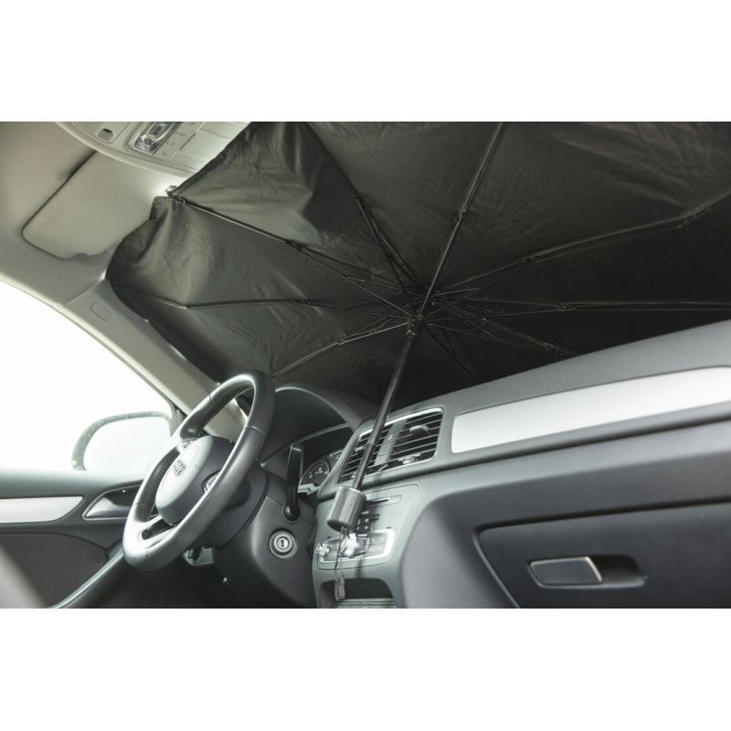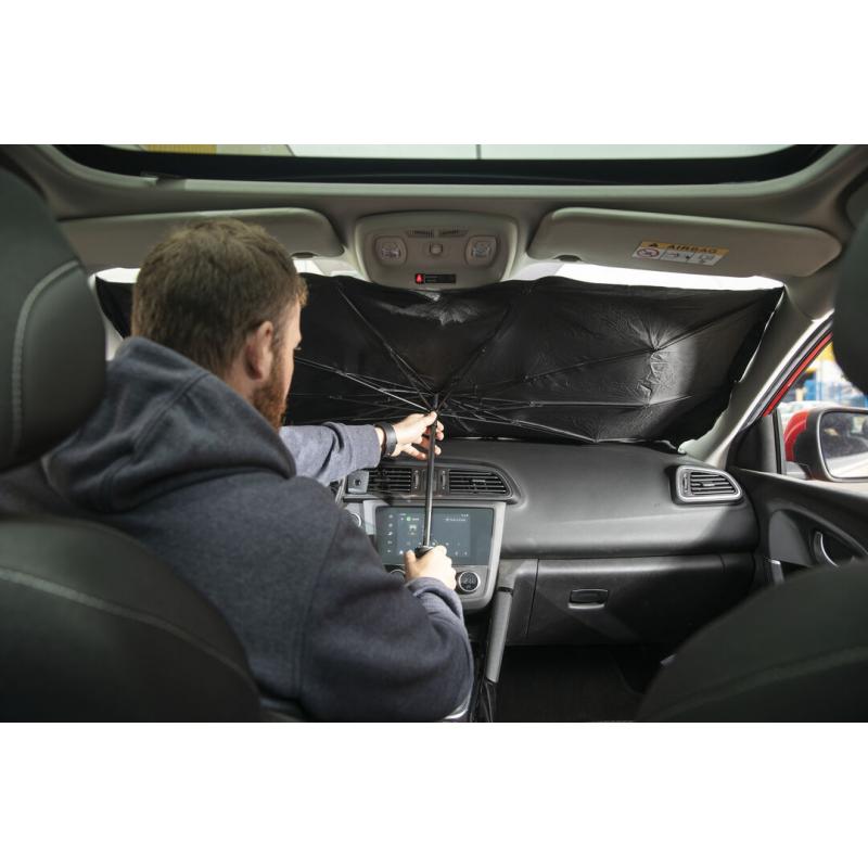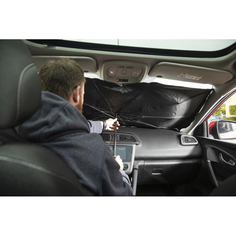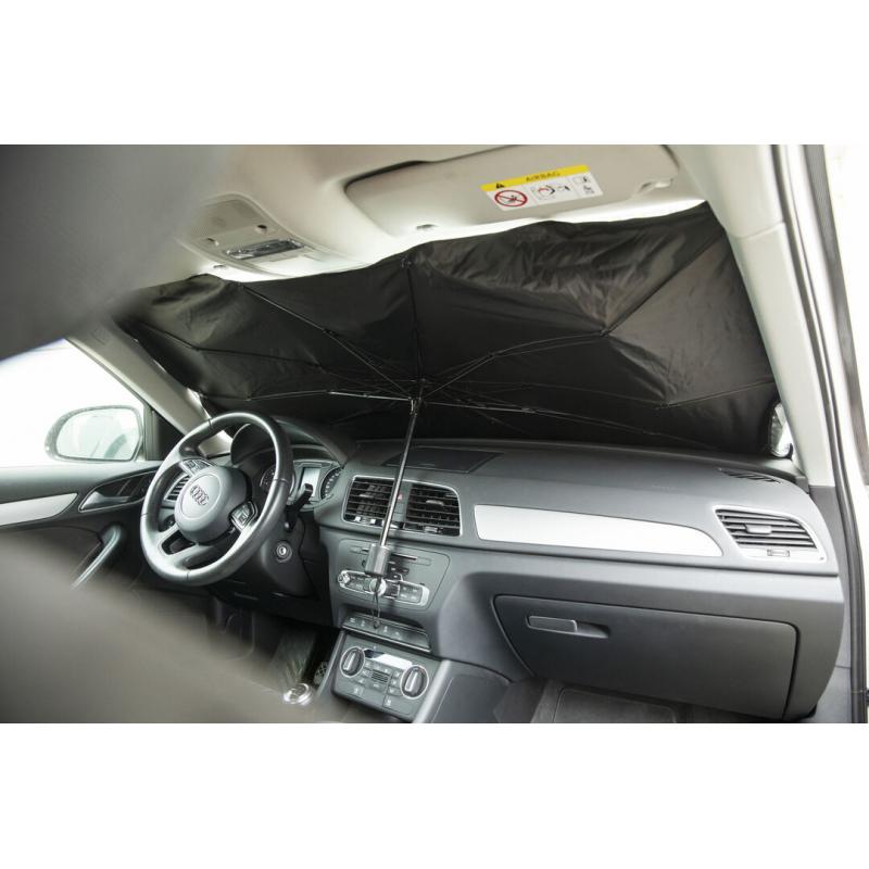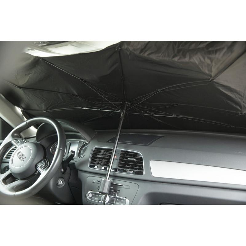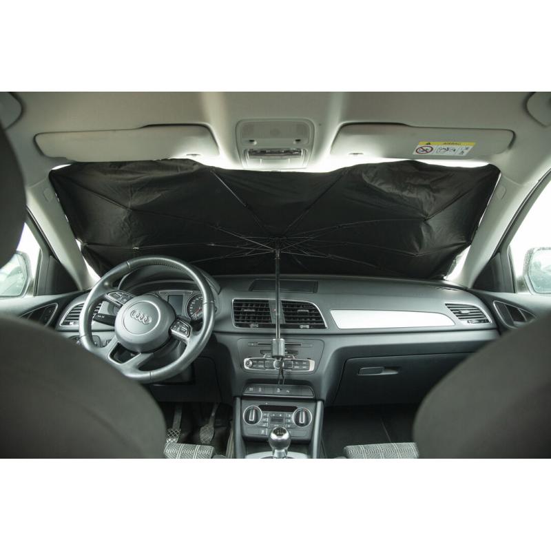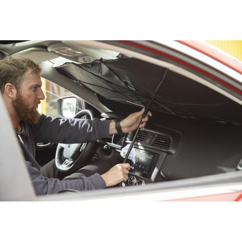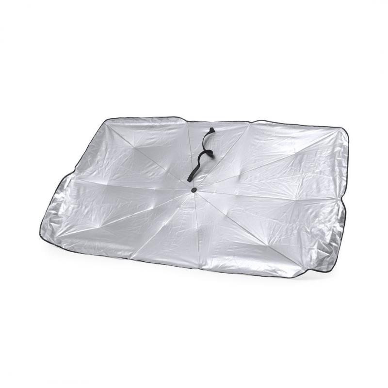 Parasol plegable para coche. Medida de 140x78cm. Con mecanismo de apertura manual y funda de políester incluida