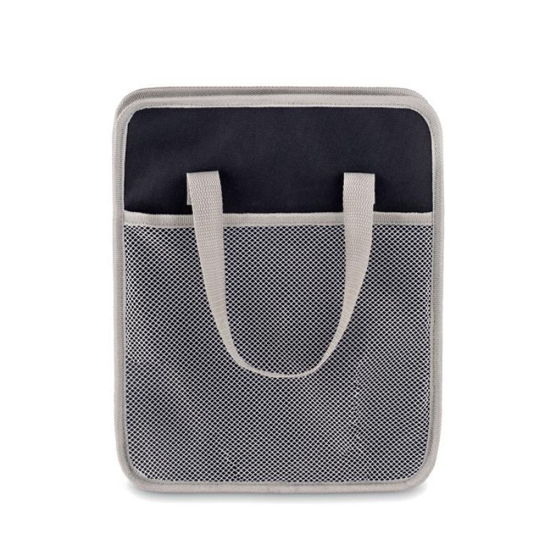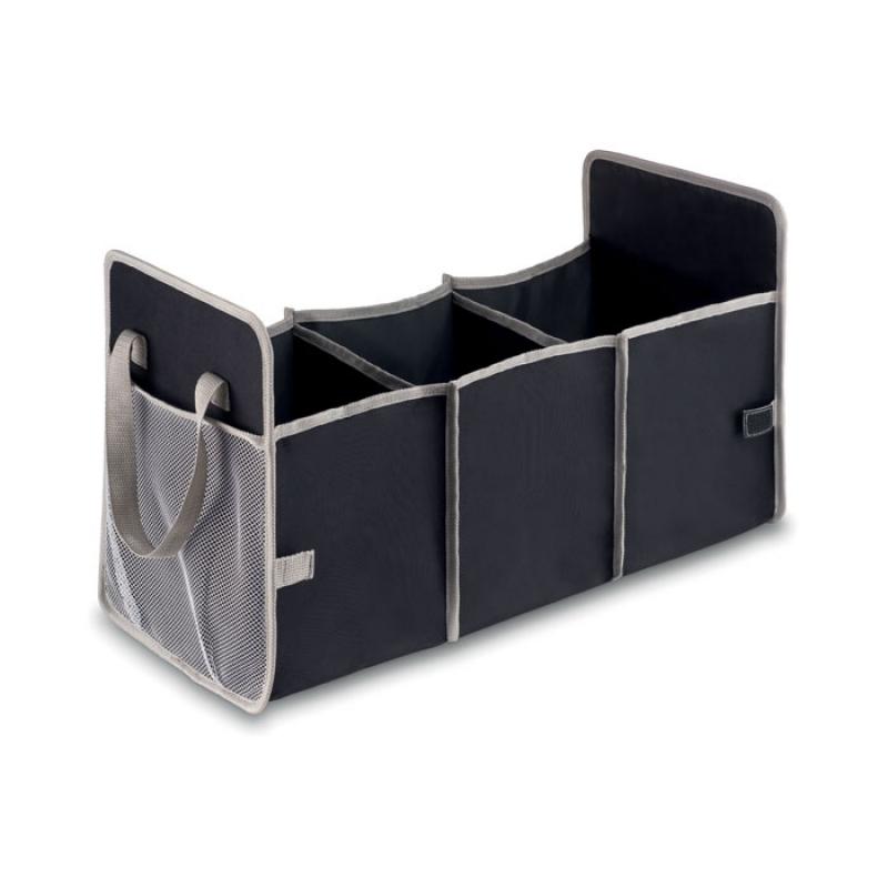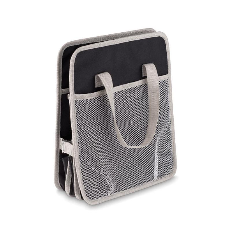 Organizador plegable para coche fabricado en poliéster 600D y bolsillo interior.