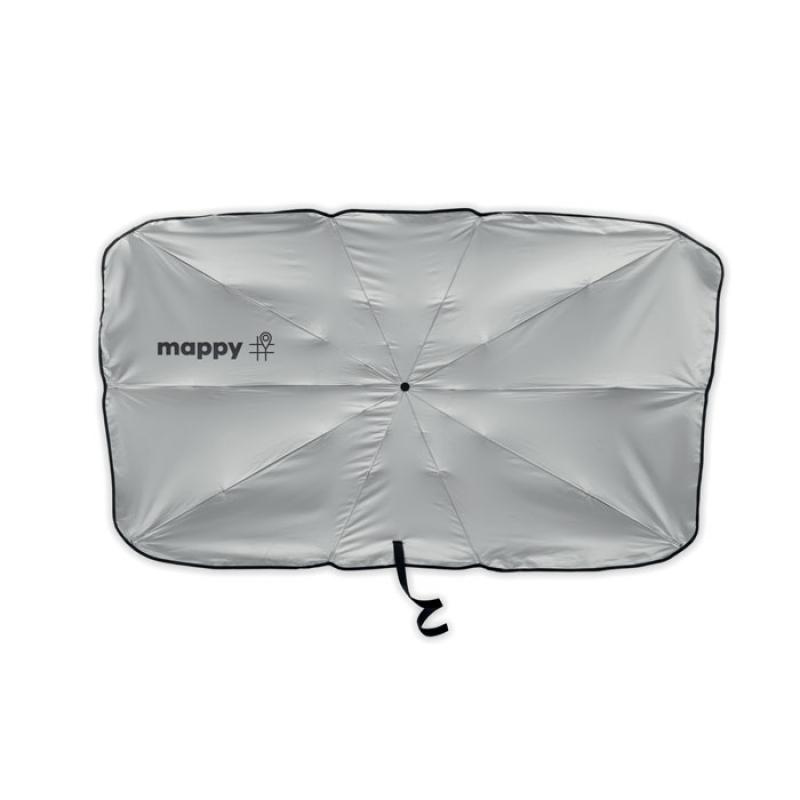 Parasol de coche en pongee 190T con forro plateado UV (SPF50) en un lado. El parasol de estilo paraguas funciona como su paraguas normal y es muy fácil de abrir y plegar de forma manual.