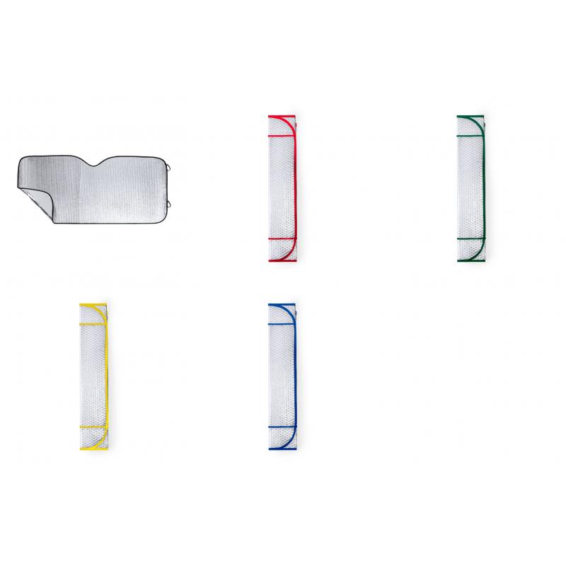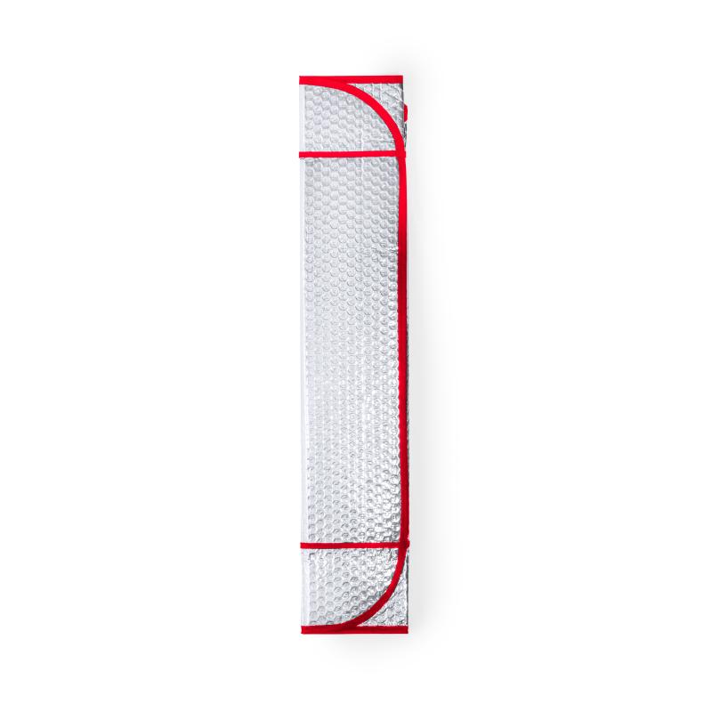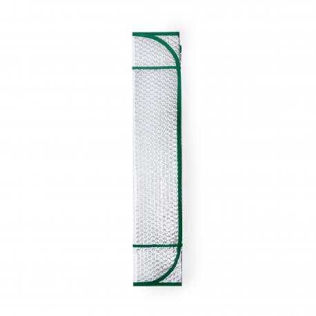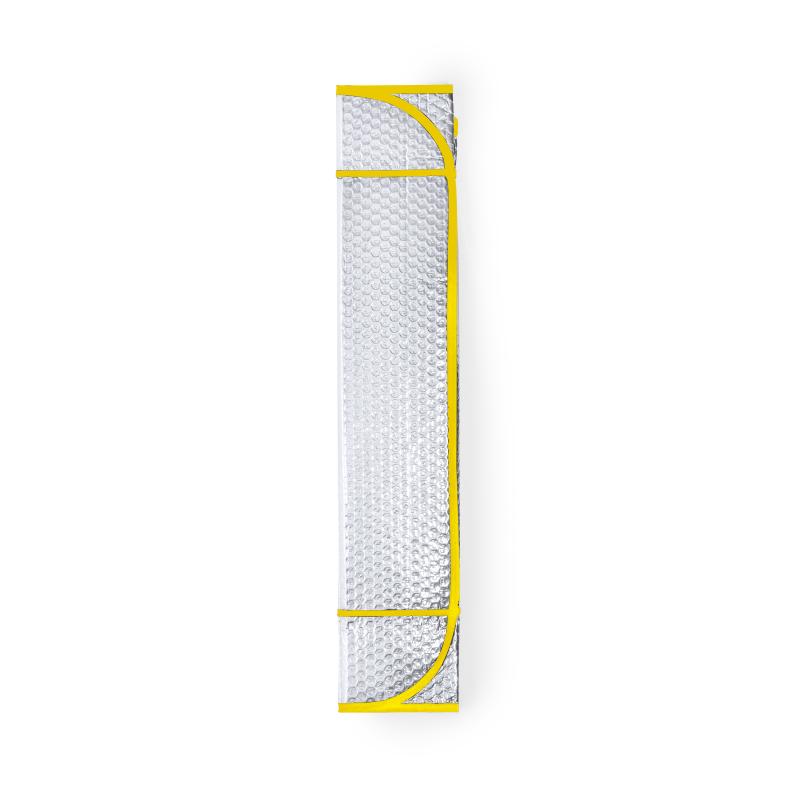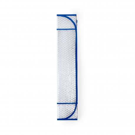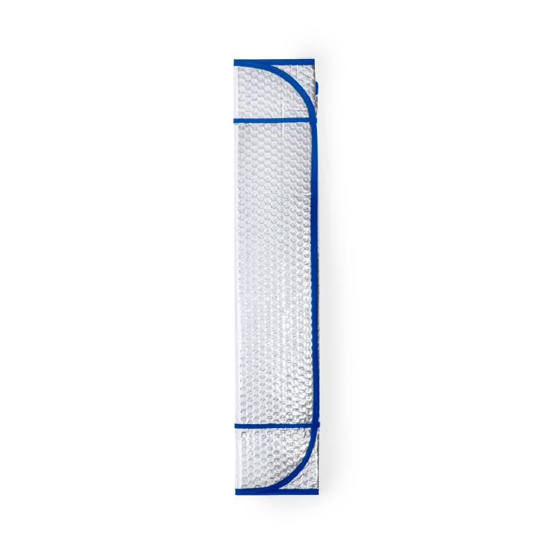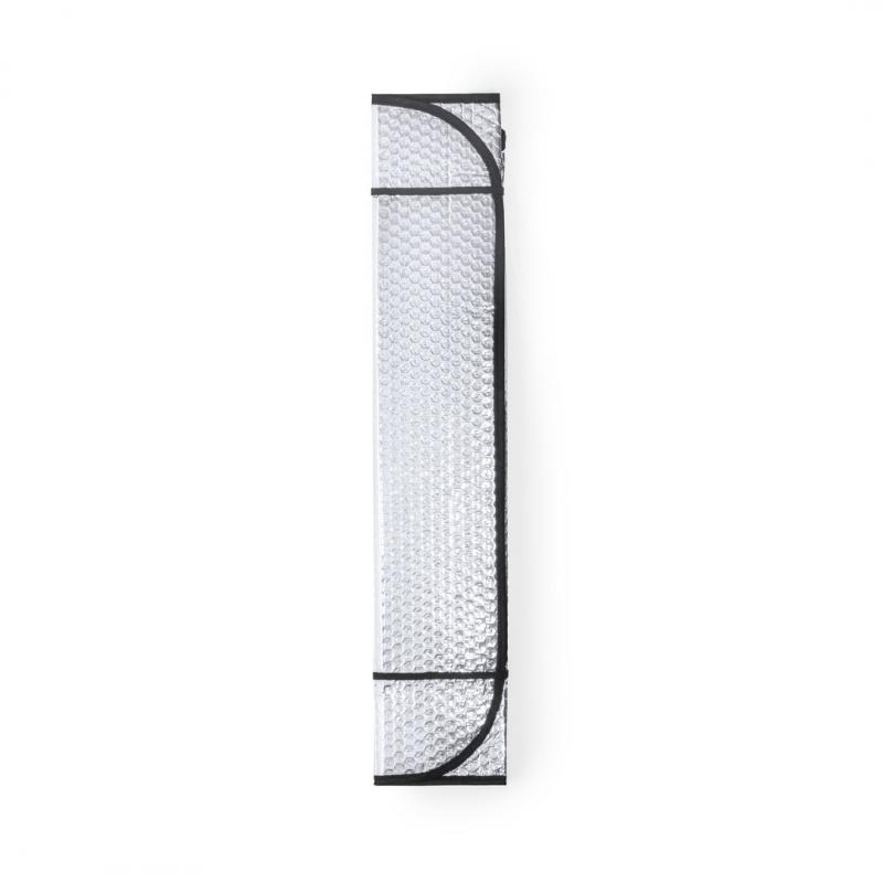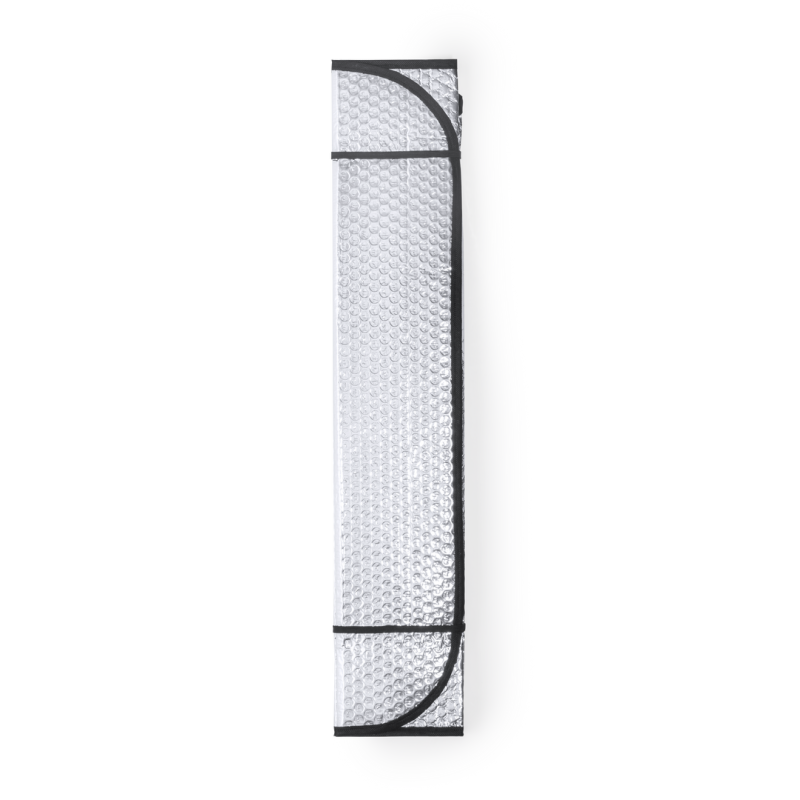 Parasol en aluminio con burbuja en ambas caras. Acabado plateado metalizado, con ribetes en color negro y en tamaño 130 x 70 cm. Con cintas elásticas para plegado y presentación desplegado en plancha para fácil impresión, con bolsas aparte.