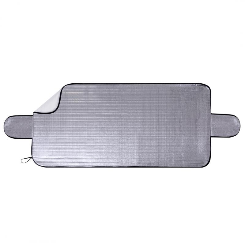 Resistente parasol de aluminio en una cara, diseñado para situarlo en el exterior de la luna delantera y como protección ante fenómenos adversos como la nieve. Incluye dos solapas laterales que se ajustan entre el marco y las puertas del vehículo, proporcionando un aislamiento adicional a la luna delantera. Enrollable y con gomas para un fácil almacenamiento.Presentado en bolsa individual reciclada.