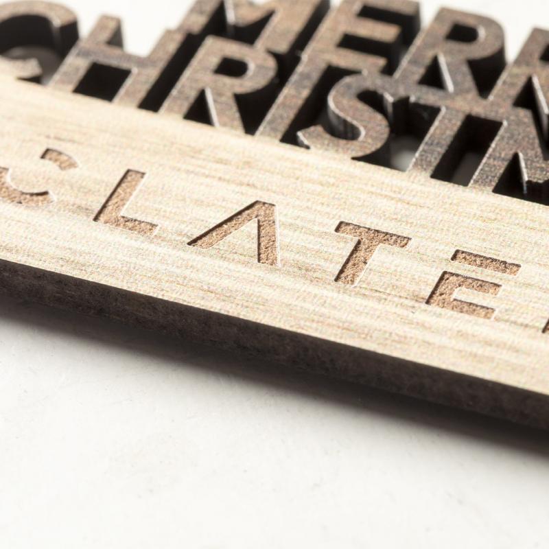 Original imán Merry Christmas fabricado en madera natural, con texto troquelado y de original acabado bicolor. Amplia superficie de marcaje y distintivo Made In Europe.