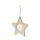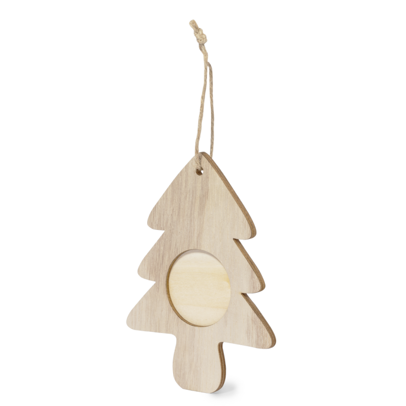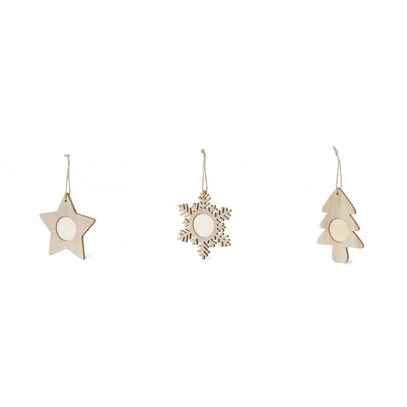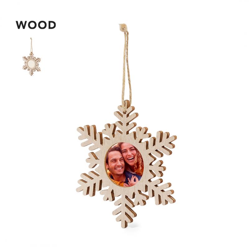 Elegantes adornos navideños con portafotos fabricados en suave madera. Incluye ventana para fotografías en tamaño 4x4 cm y accesorio para colgar en yute natural. Disponible en 3 originales diseños: Copo de Nieve, Árbol de Navidad y Estrella. Presentado en bolsa individual reciclada.Elaborado con elementos vegetales para así fomentar la utilización de materias primas naturales y reducir las emisiones contaminantes.