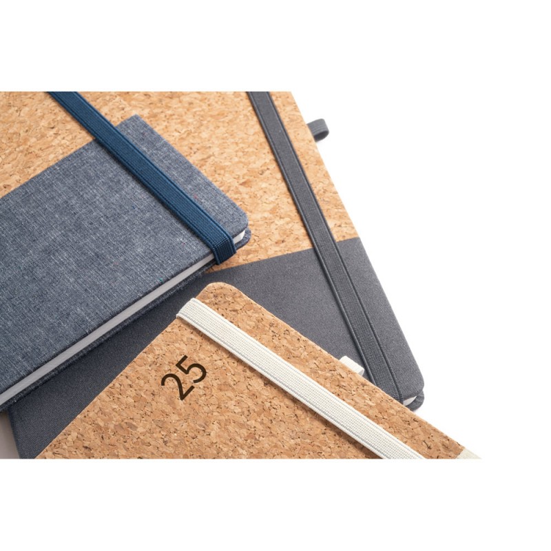 Agenda A5 en corcho y lino con soporte para bolígrafo y cierre con cinta elástica del mismo color. Se suministra con funda de non-woven. Bolígrafo no incluido