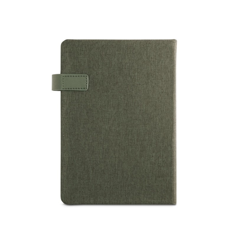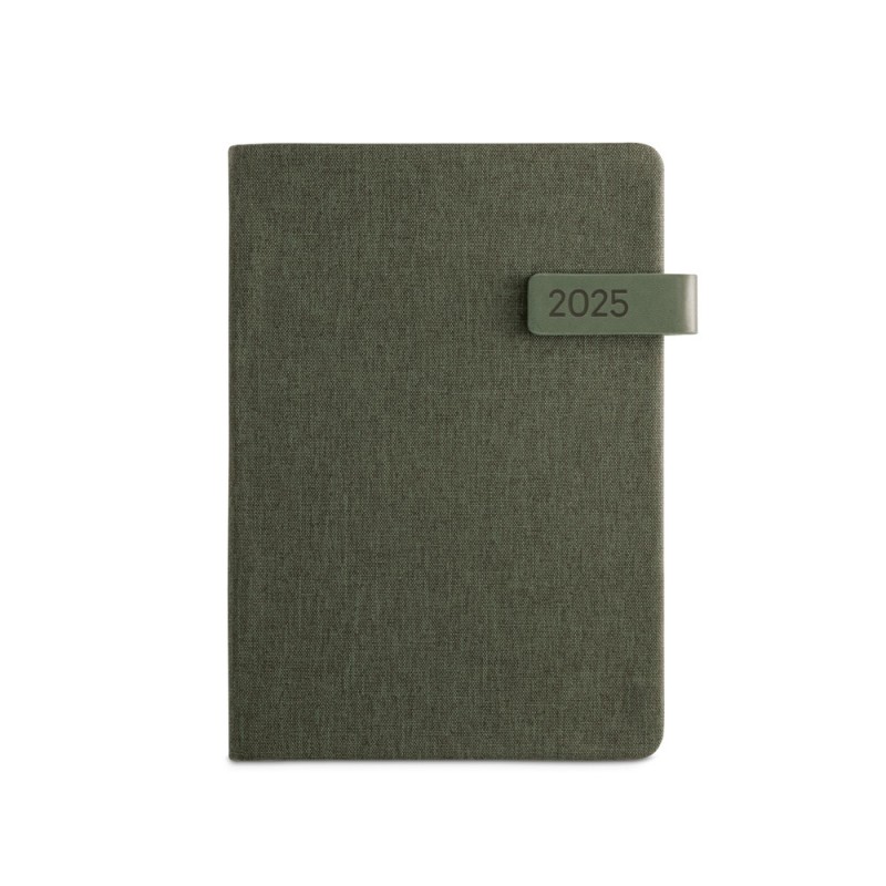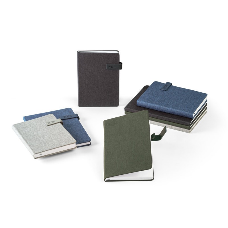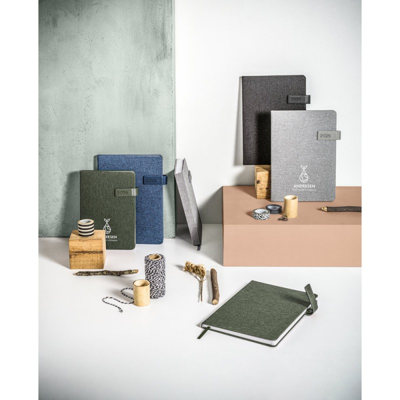 Agenda A5 con tapa de PET reciclado. Incluye soporte para bolígrafo y cierre de goma del mismo color. Se suministra con funda de non-woven. Bolígrafo no incluido