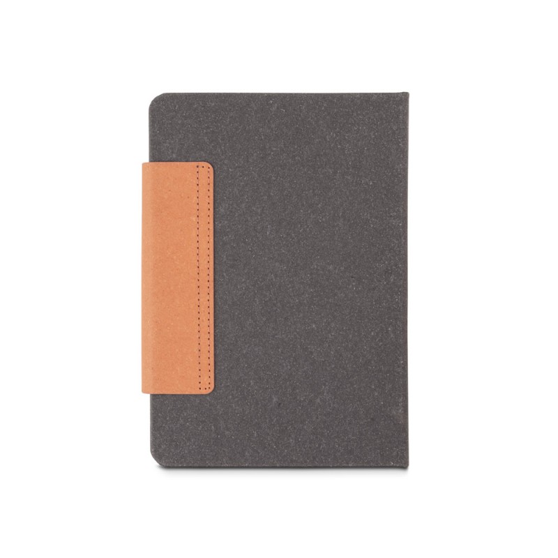 Agenda A5 en piel reciclada con cierre magnético. Con portalápices y marcador de cinta. Se suministra con una bolsa non-woven. Bolígrafo incluido. 148 x 210 mm | Bolsa: 205 x 250 mm