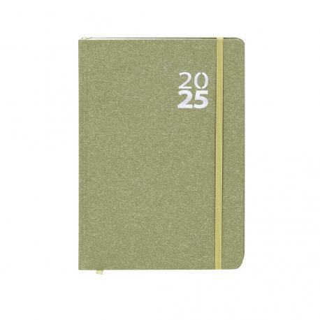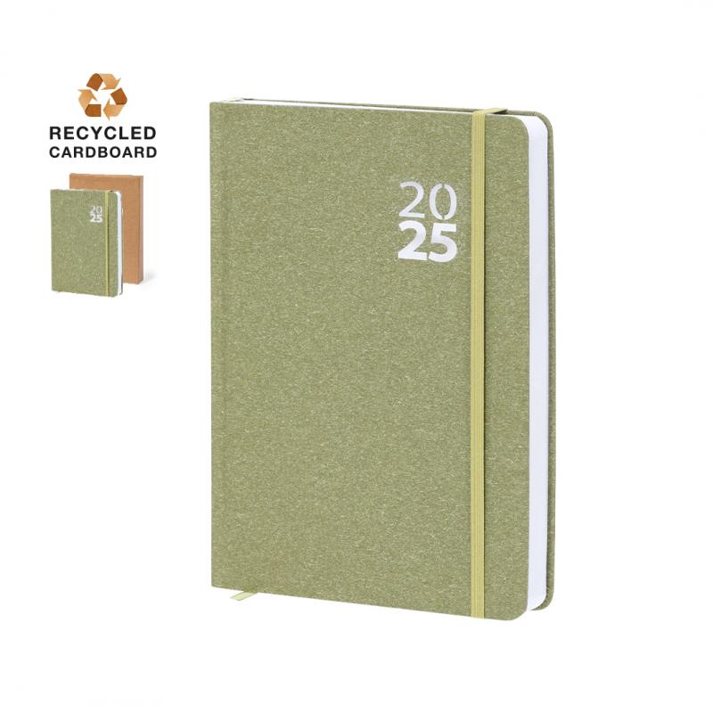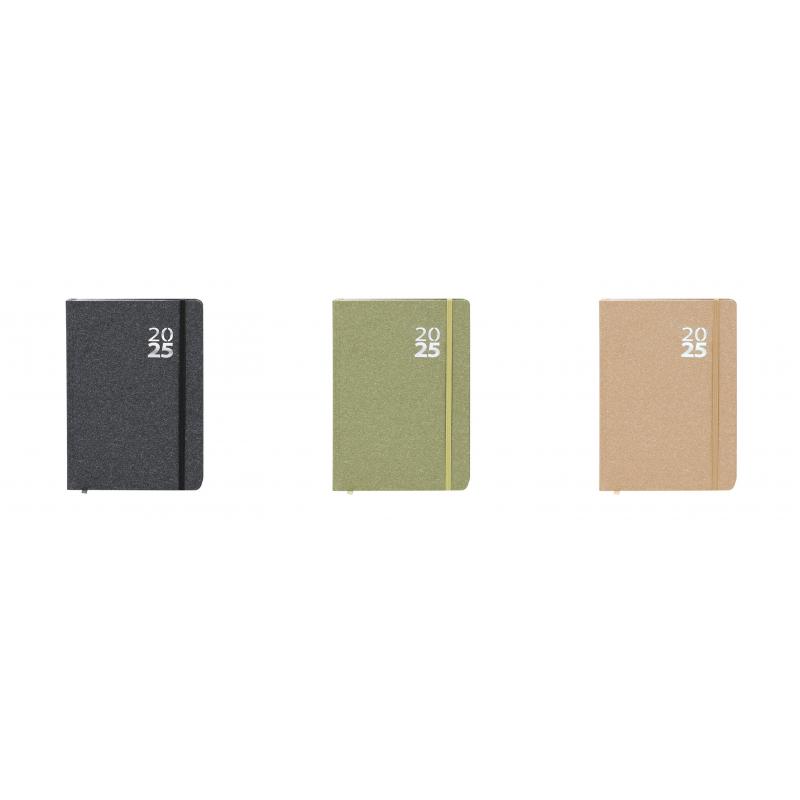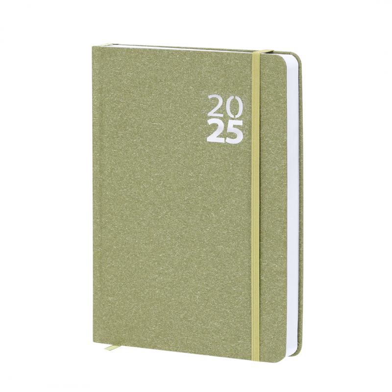 Agenda de tamaño A5 en Cartón Reciclado. Con cubiertas rígidas y elástico de cierre a juego. Incluye caja kraft de presentación. Con distintitivo ECO.Diseño página día, zona de anotaciones y marcapáginas de tela. En 2 idiomas: castellano e inglés. El Cartón Reciclado proviene del reaprovechamiento de excedente de fabricaciones y reciclaje de papel en el final de su vida útil, convirtiéndose en un lienzo ecológico y sostenible.