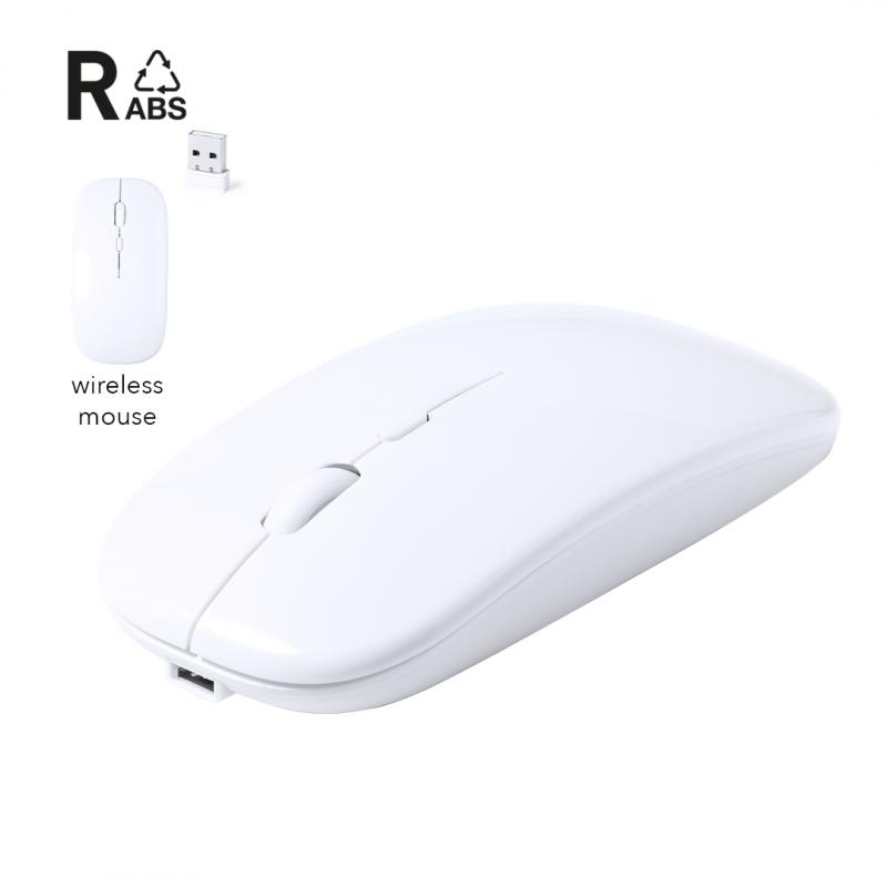 Ratón óptico inalámbrico con diseño ergonómico. Carcasa fabricada en ABS reciclado (RABS) y con certificación RCS, que garantiza el origen reciclado del mismo. Recargable USB (cable incluido) y presentado en caja individual de diseño eco en cartón kraft.