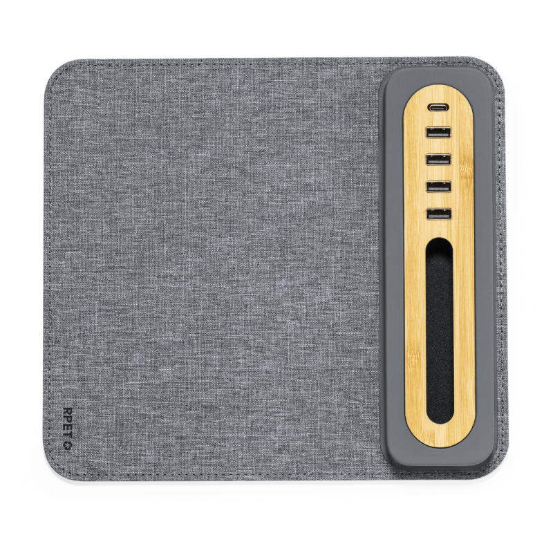 Elegante y funcional alfombrilla fabricada en combinación de suave poliéster RPET y bambú. Con puerto tipo C y cuatro puertos USB 2.0, permitiendo conectar y cargar los dispositivos fácilmente. Con soporte para smartphone y base antideslizante que garantiza un uso cómodo y estable. Introduce una nueva era de conectividad y sostenibilidad en el espacio de trabajo.Presentada en caja individual de diseño kraft y en bolsa reciclada.El material RPET se elabora a partir de plástico reciclado, para así fomentar la reutilización de residuos plásticos y ayudar a la sostenibilidad del planeta.
