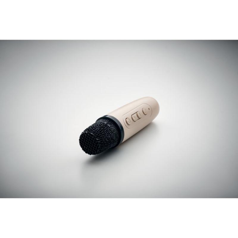 Conjunto de karaoke que incluye altavoz inalámbrico de 5 W con luz LED de colores cambiantes en ABS reciclado con asa de PU y micrófono. Altavoz integrado con batería de 800 mAh y micrófono con batería de 400 mAh.Recipiente :
