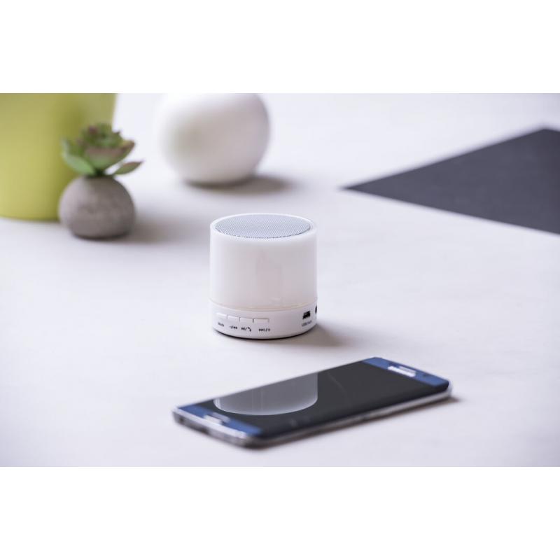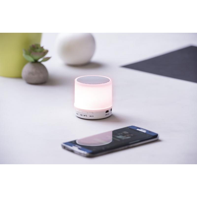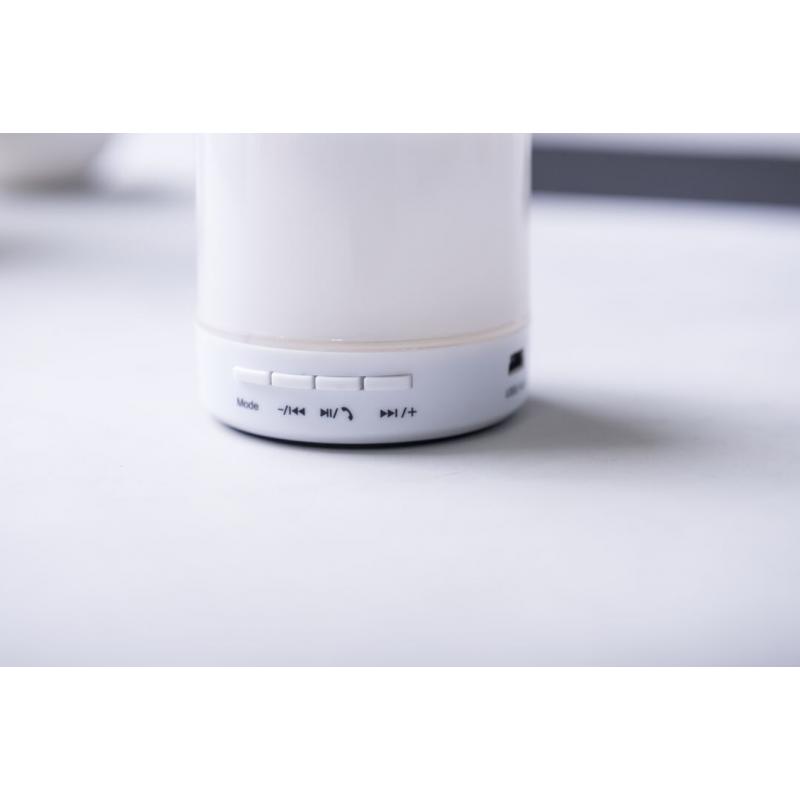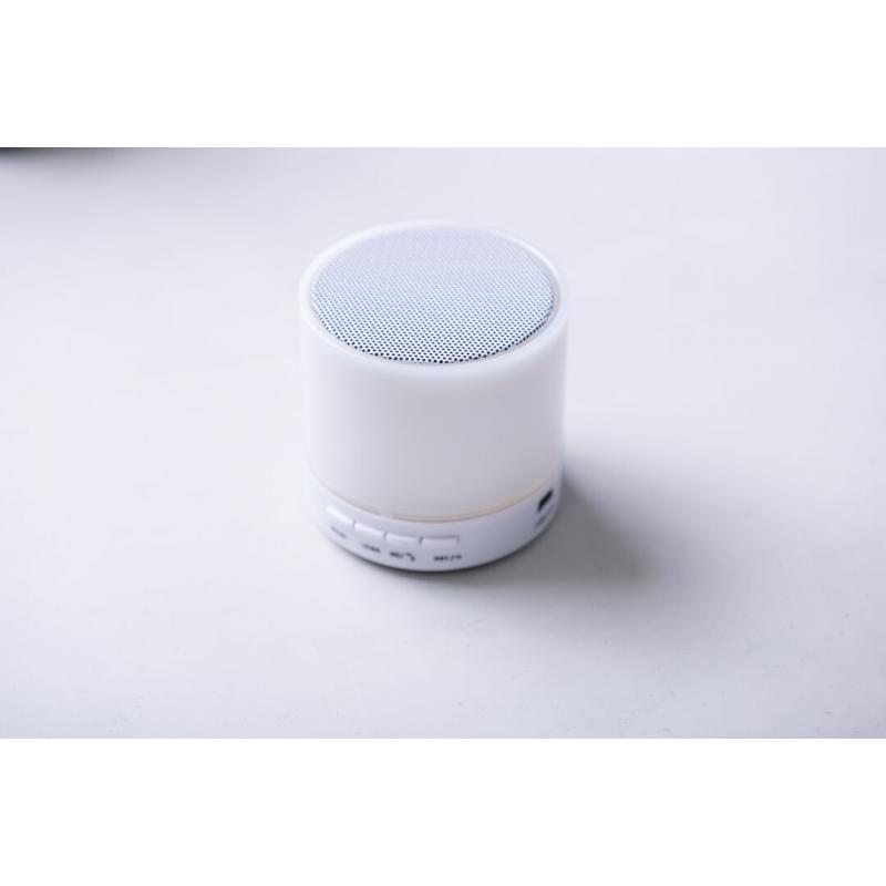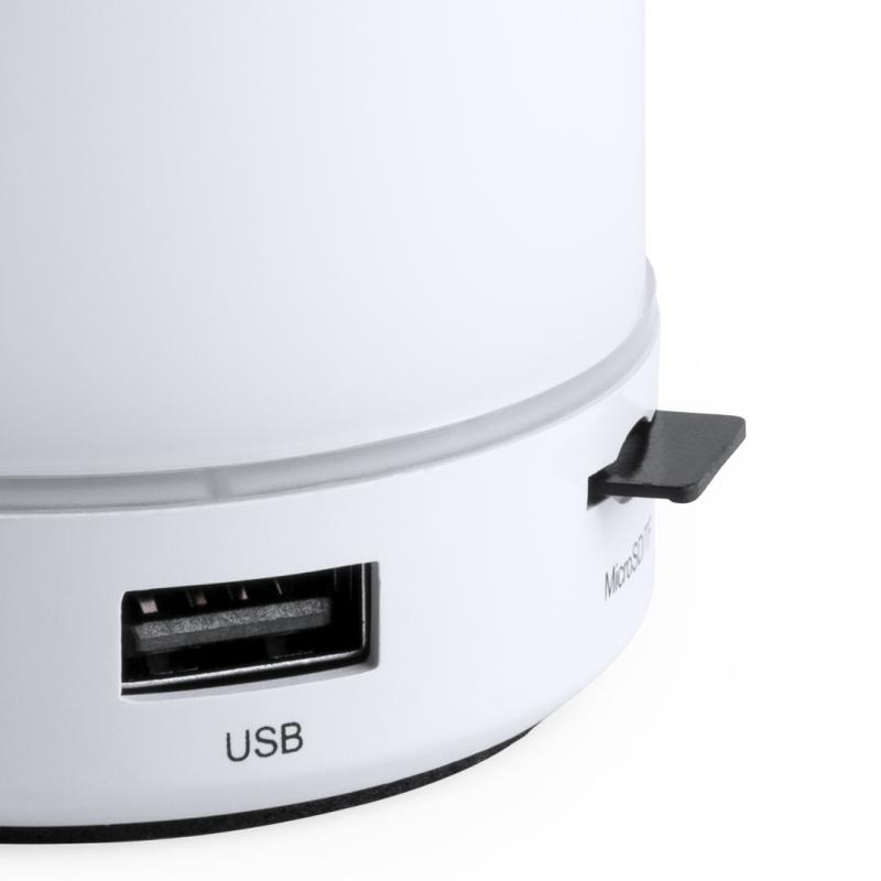 Altavoz de Tecnología Led Inteligente y conexión Bluetooth®. 3W de potencia, con ranura USB para reproducir música desde unidad externa y función manos libres. Ranura para tarjetas micro SD de hasta 32 GB de capacidad, entrada auxiliar de línea mediante conexión jack de 3,5mm y base antideslizante. Radio FM, con luz multicolor, recargable mediante cable USB -incluido- y presentado en una atractiva caja de diseño.