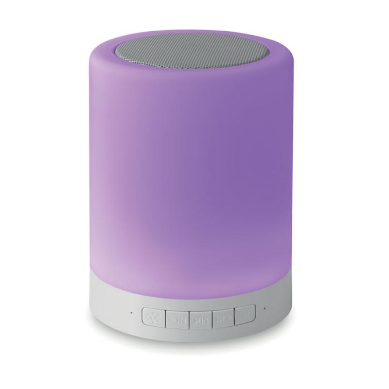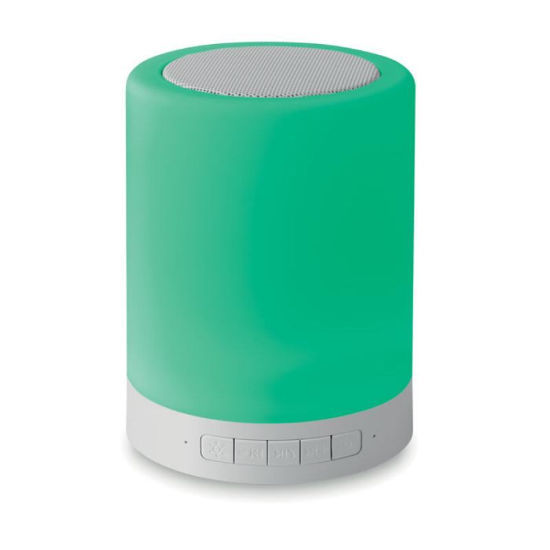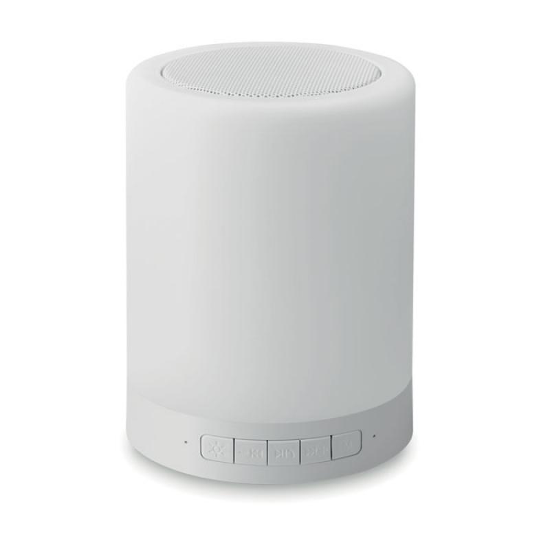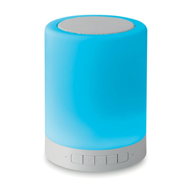 Altavoz inalámbrico con regulador táctil de luz (1,6W) e intensidad con 6 colores cambiantes. Incluye puerto para tarjeta SD. Batería recargable de 2000 mAh. Output: 3W. Tiempo de reproducción: 2 horas aprox.