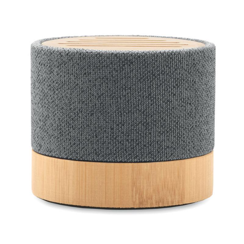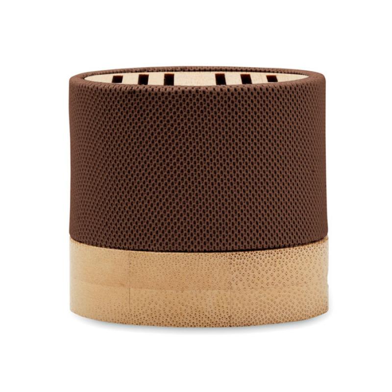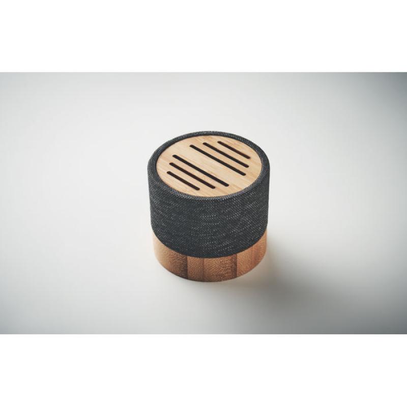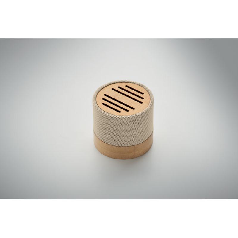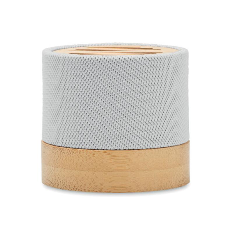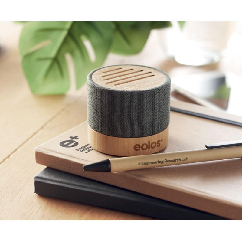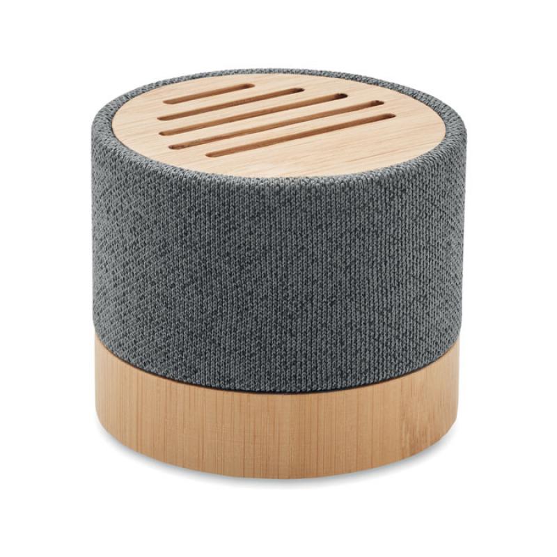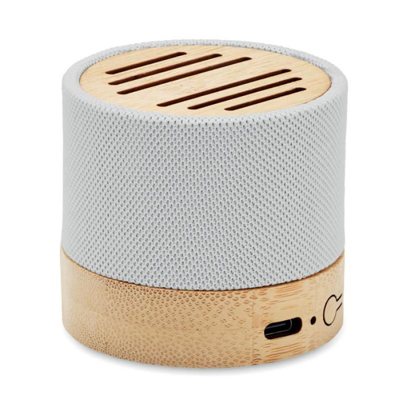 Altavoz inalámbrico 5.0 con carcasa de RPET y bambú en parte superior. Indicador LED. Batería recargable de Li-ION de 400 mAh. Ranura tarjetas SD y cable AUX/ USB. Función manos libres. Output: 3W, 3 Ohm y 5V. Tiempo de repro. aprox. 3h.