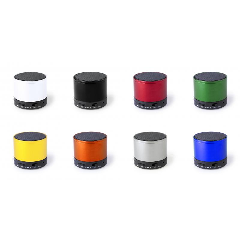 Compacto altavoz con conexión Bluetooth® 5.0 Y 3W de potencia.Función manos libres, ranura para tarjetas mini SD de hasta 64 GB de capacidad, función radio FM y entrada auxiliar de línea mediante conexión jack de 3,5mm. Con soportes de goma antideslizantes en la base. Compatible con iOS y Android, incluye cable de carga y cable auxiliar jack de 3,5mm. Presentado en atractiva caja de diseño, con manual de instrucciones en español e inglés. Disponible en extensa gama de colores metalizados.