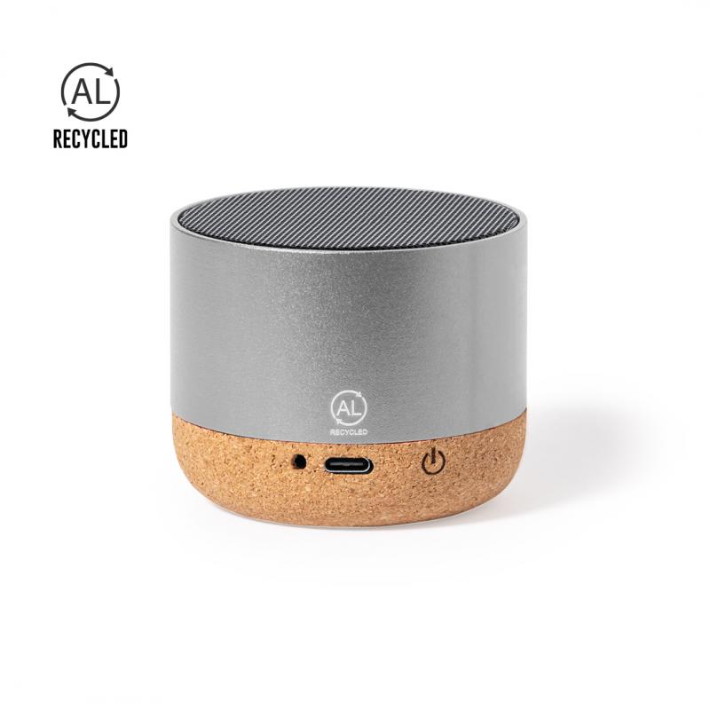 Altavoz fabricado en combinación eco con carcasa de aluminio reciclado y base de corcho natural. Con conexión Bluetooth® y 3W de potencia. Batería de litio de 300mAh. Incluye distintivo aluminio reciclado. Presentado en caja individual de diseño kraft. Disponible manual de instrucciones en español e inglés.El aluminio reciclado es un material con posibilidades de reciclaje casi infinitas, sin perder sus propiedades originales y consumiendo menos energía en este proceso.Certificación GRS (Global Recycled Standard / Estándar de Reciclaje Global), que garantiza el origen reciclado del material usado para fabricar el producto.
