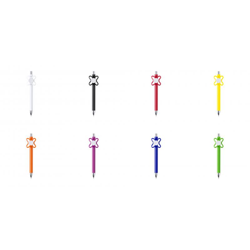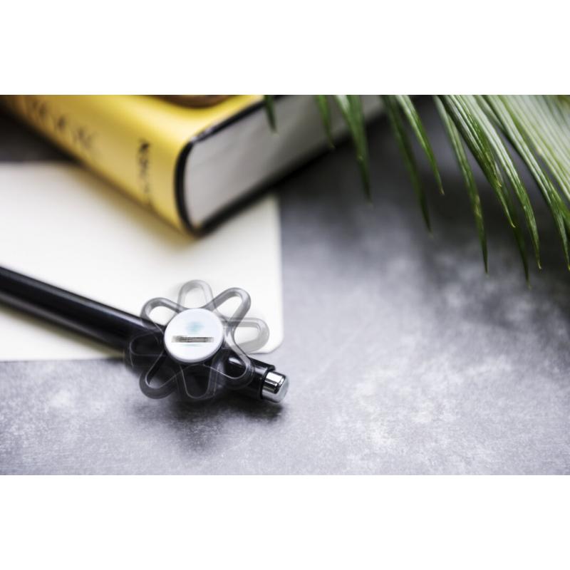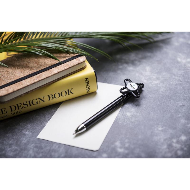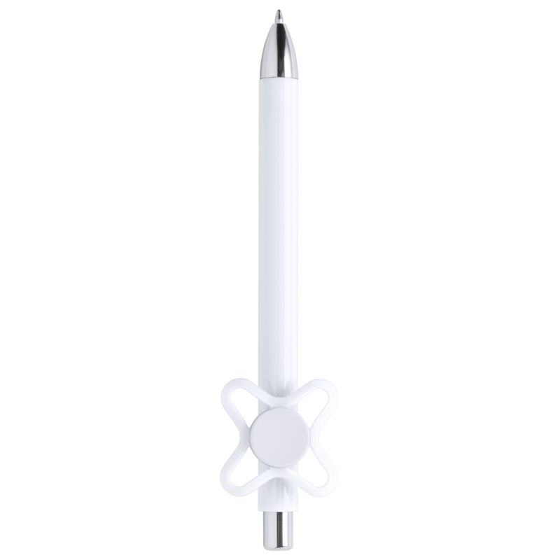 Original bolígrafo spinner antiestrés de mecanismo pulsador y divertido diseño con accesorios en color plateado y cuerpo de acabado sólido en colores brillantes. Especialmente diseñado para tampografía en clip y en cuerpo. De cartucho jumbo y en tinta azul.