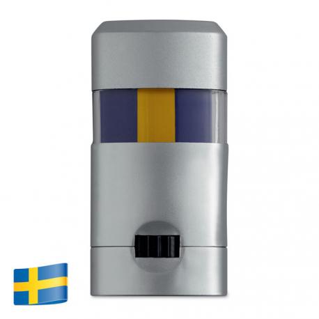 Pinturas de diferentes banderas en caja plateada y transparente.