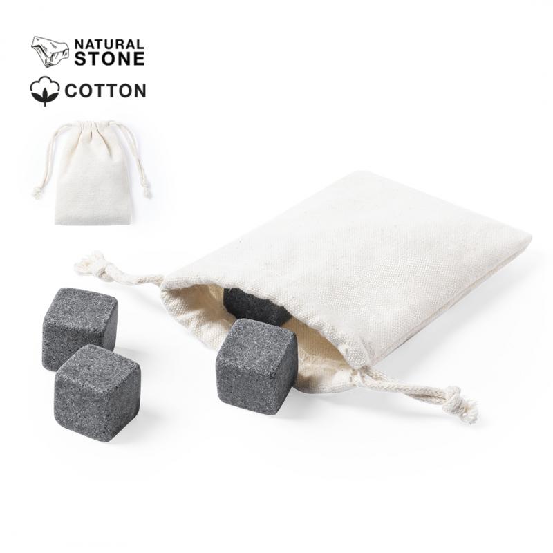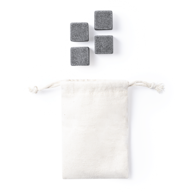 Set de 4 cubitos reutilizables. Fabricados en piedra natural esteatita, también conocida como piedra o roca de jabón, que mantiene la bebida fría sin alterar sus propiedades al no diluir su contenido en agua, además de mantener el sabor original de la misma. Presentados en funda de algodón con cordón de cierre.