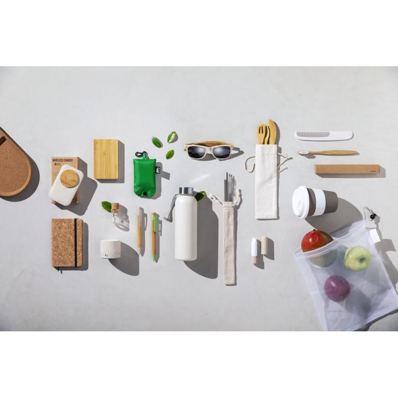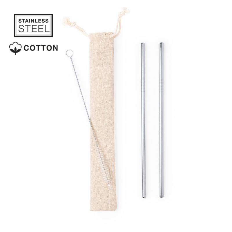 Set de 2 pajitas reutilizables en acero inoxidable. Con accesorio limpiador incluido y presentadas en bolsita de algodón natural con cuerdas autocierre.
