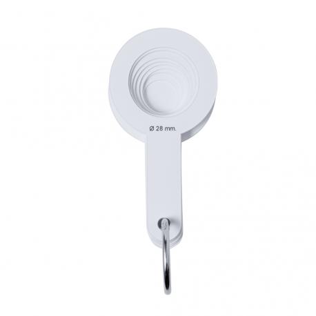 Calibrador manual fabricado en resistente PP. Para diá metros desde 14mm hasta 28mm, perfecto para la medición y clasificación a tiempo real y según tamaños. Cuenta con 8 plantillas que van aumentando gradualmente cada 2mm, una de ellas con superficie plana para marcaje. Unidos por una práctica anilla de transporte.