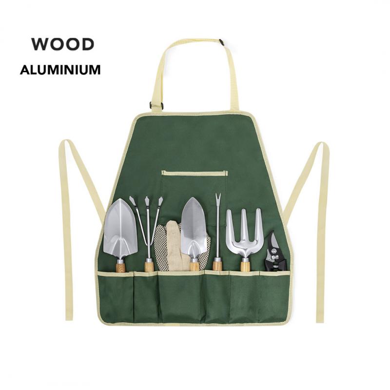 Completo set de jardinería con 7 accesorios y delantal ajustable con bolsillos. Incluye 2 palas de diferentes tamaños, dos rastrillos, un punzón, tijeras de podar y guantes para proteger las manos. Presentado en caja de diseño kraft.