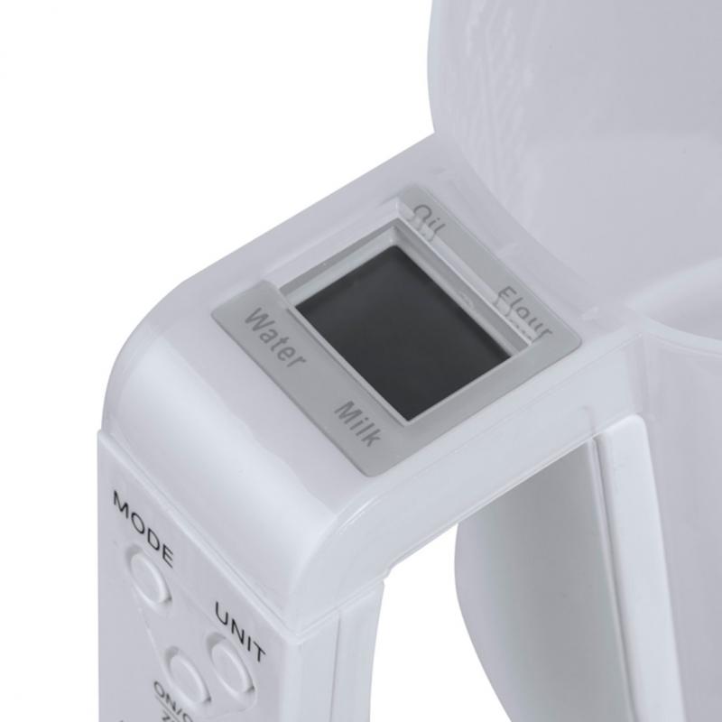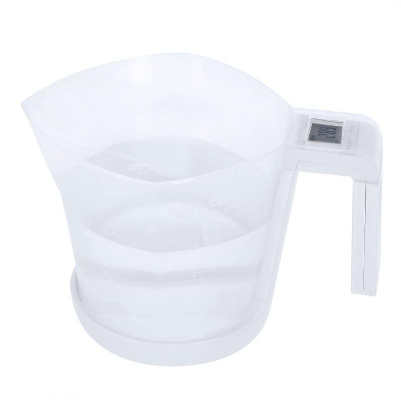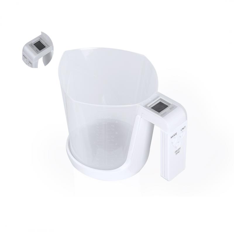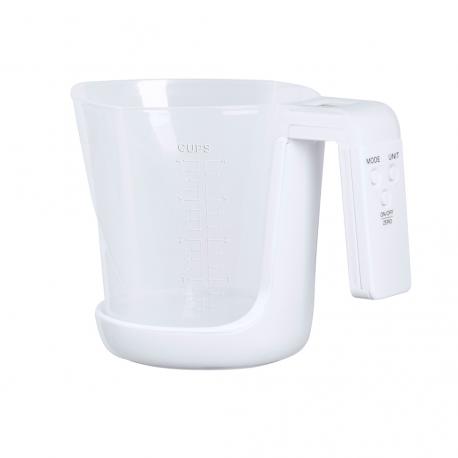 Báscula con jarra medidora integrada, fabricada en resistente combinación de PP y ABS. Pantalla LCD con control por botones y función de tara, con capacidad máxima para 5 kg de peso y válida para medir elementos líquidos o sólidos.Incluye Jarra medidora de 1L de capacidad, con multitud de opciones y vertedor para evitar derrames:-1L, con medidor lateral en tramos de 50 ml.-32 oz, con medidor lateral en tramos de 2 oz. -Medición rápida en volumen de tazas.Funciona con pila de botón (incluida) y viene presentada individualmente en caja.