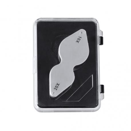 Lupa plegable doble con aumento 10x y 20x, fabricada en resistente metal. Gran potencia de aumento para obtener una visión muy cercana de los detalles más pequeños, con ampliación sin distorsión. Ideal para inspeccionar objetos de tamaño reducido, textos, etc. Además, viene dentro de un estuche con interior acolchado para una mayor protección. Presentada en caja de cartón negra.
